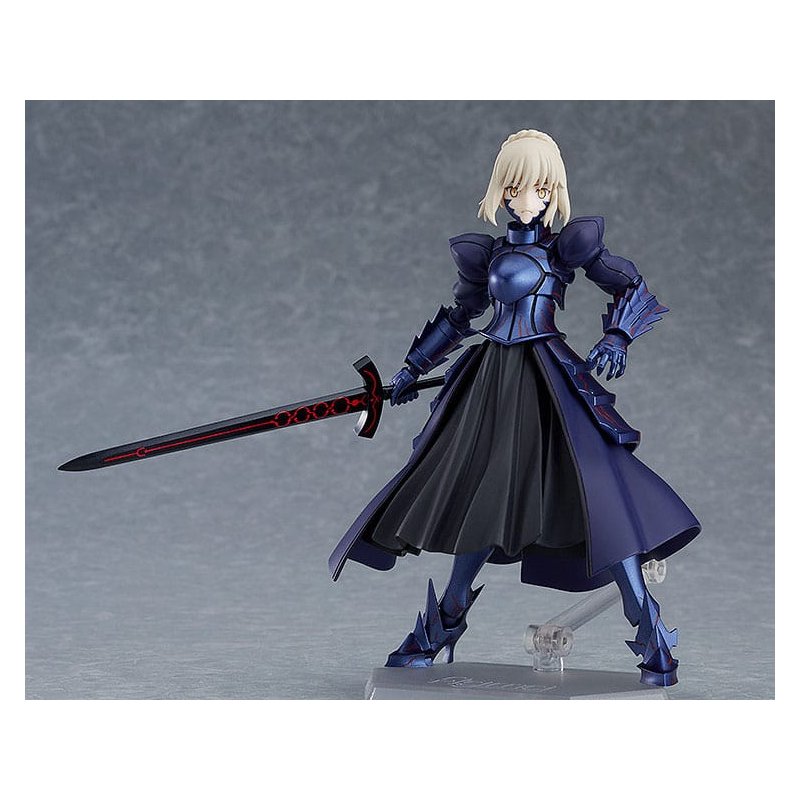 From the anime movie series "Fate/stay night: Heaven's Feel" comes the King of Knights consumed by darkness, figma Saber Alter 2.0!- The sculpting of the figma has been redone from the ground up to be more awe-inspiring than ever before. - Drawer joints are used in her shoulders allowing for broader posing options, such as poses with her wielding her sword in both hands. - A flexible plastic is used for important areas, allowing proportions to be kept without compromising posability. - The lustrous appearance of her blood-streaked black armor has been faithfully captured, preserving the truly dark atmosphere that surrounds her. - She comes with three face plates including an expressionless face, a shouting face for combat scenes and a smiling face. - She comes with Excalibur Morgan as an optional part, along with front hair parts used to display her with her mask on as well as fluttering front hair parts for more posing options