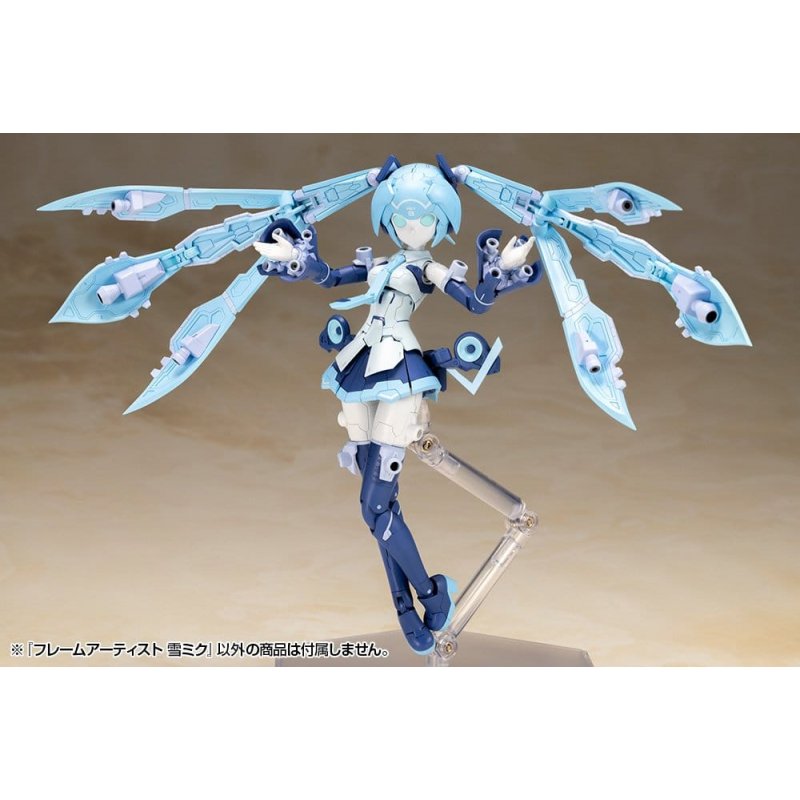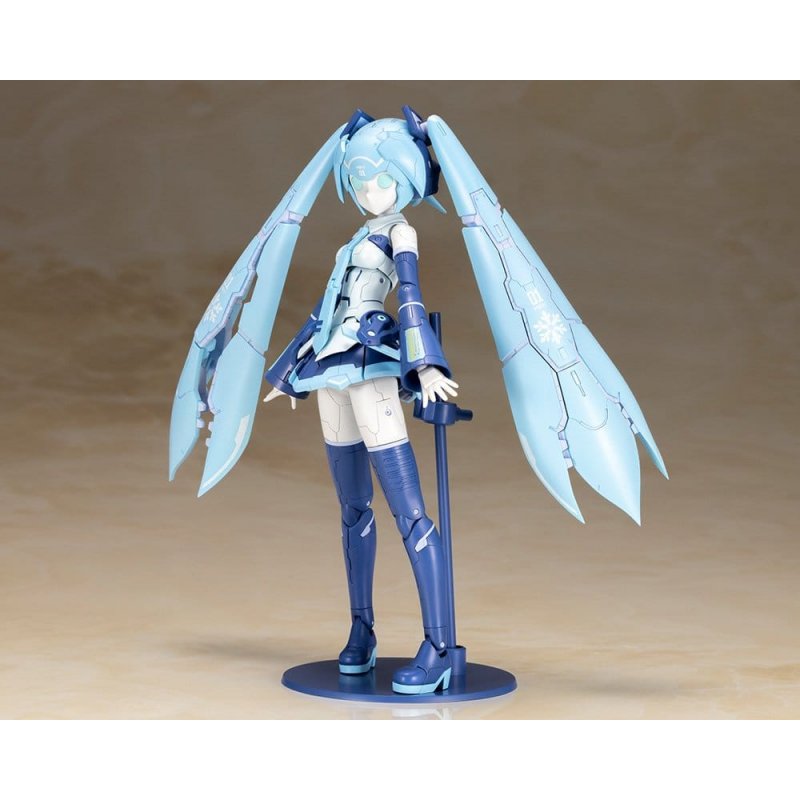 Frame Music Girl Snow Miku transforms into a robot! In a collaboration between Kotobukiya’s original Frame Arms series and Snow Miku, Frame Artist (FA) Snow Miku comes to life! The design for this model was created by Takayuki Yanase based on the previously released Frame Music Girl Snow Miku designed by Humikane Shimada and features a distinct design from the Frame Arms lineup. - The model features a white and blue color scheme. This multi-colored kit allows users to build a realistic model with no painting required. - One mecha face part in line with the product design is included along with one standard Frame Music Girl Snow Miku Another Color Ver. pre-printed singing face part. - Besides the mecha head part in line with the product design, a head part with bangs is also included. - The twintails are adjustable and vernier thrusters expandable. - A microphone and microphone stand are included. - The skirt is adjustable, and the range of movement for the legs has increased. - The kit includes five sets of PVC hand parts which are compatible with the Frame Arms Girl series. - The kit includes decals for the eyes and other markings. - The model is equipped with 3mm connection points on parts such as the back, waist and thighs that are compatible with parts from the existing M.S.G, Frame Arms, and Frame Arms Girl series. *Frame Architect is not included in this model kit. Product Size: 16 cm