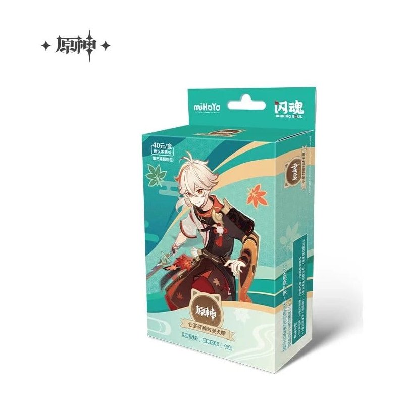 This is a pre-built starter deck for the Genshin Impact Trading Card Game by HoYoverse. This deck features the character Kaedehara Kazuha from Series 3. Each Starter Deck contains 40 cards: 3 Character Cards, 30 Action Cards, and 7 Accessory Cards.