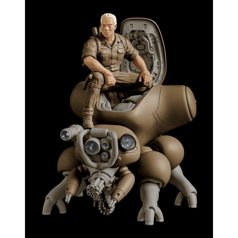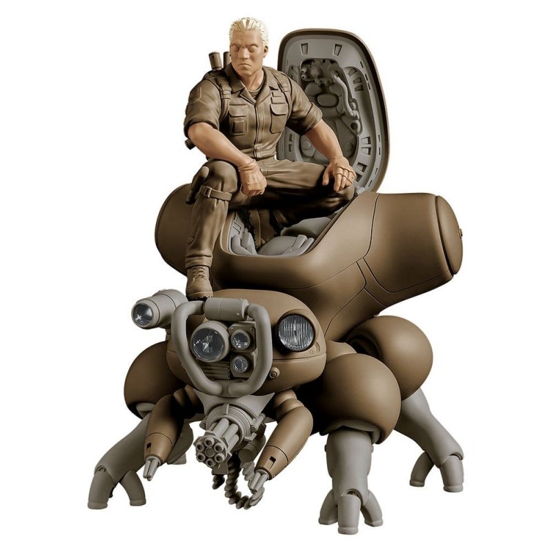 Presenting the newest addition to the minimum factory lineup of 1/20 scale palm-sized plastic models, Batou with Fuchikoma! Taking inspiration from early illustrations from the "Ghost in the Shell" manga as well as the theatrical release, these figures are an impressive sight atop any desk. The kit includes Batou in a fixed pose sitting atop Fuchikoma and a Gatling gun equipped to its head. The olive green plastic gives the models a military feel.