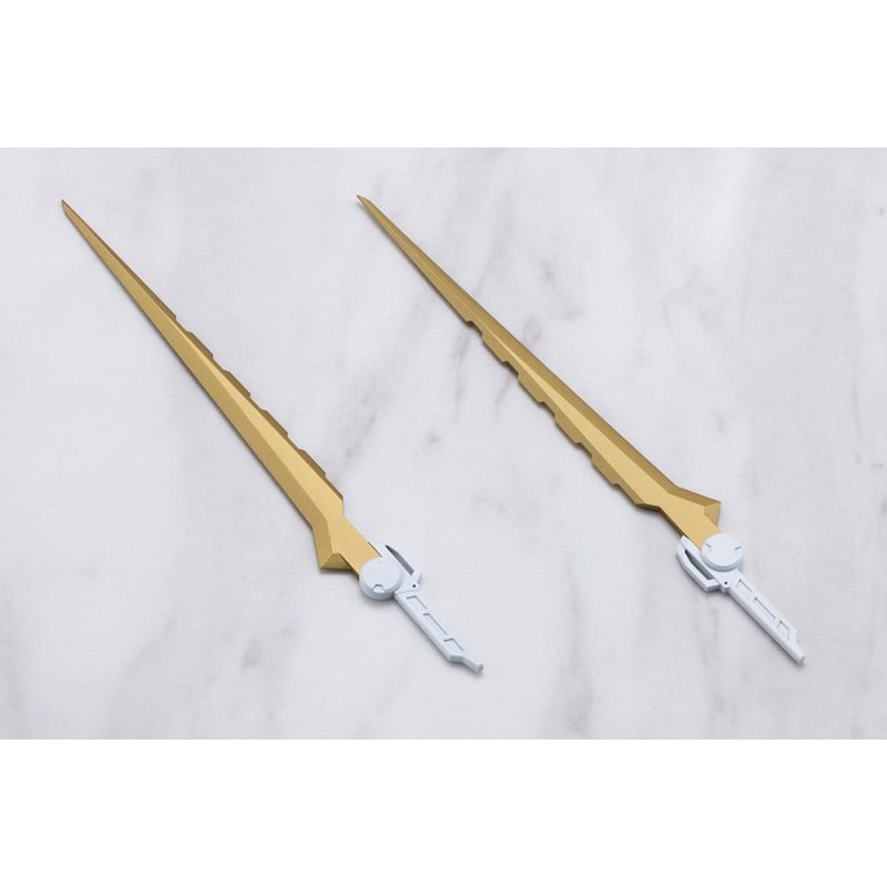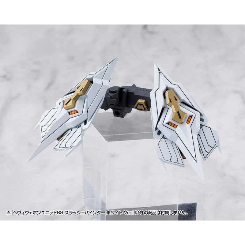 Witness the power of razor-sharp wings that tear through the sky! An evolution in slashing design!A powerful, large-scale thruster unit joins the Heavy Weapon Unit lineup. It can be attached to robot or character models and serves as an expansion part that greatly increases customization.Set Specifications:- The kit consists of two main components: A backpack unit and wing slash units. The backpack unit is fitted with articulated left and right arms that allow for flexible positioning of the wing slash units. - The wing slash units can be reconfigured from the standard Quick Mode into Sharpener Mode by adding blade parts, transforming the silhouette into a more combat-ready style that dramatically changes the look and feel of any model. - In Sharpener Mode, the tail blades connect via 3mm connection joints and can be removed for use as customization parts. They can also be attached to the included grips to function as single-edged long swords. - The kit is molded in three colors: gray for the backpack unit, white for the wing slash units, and gold for the tail blades.The design was done by sera, well-known for their stylish mecha designs, who was also behind series such as Forme Arms, Stride Rifle, and Customize Blade.Included Items:- 1 x Backpack Unit - 2 x Wing Slash Units - 4 x Tail Blades - 2 x Single-Edged Long Sword Grips