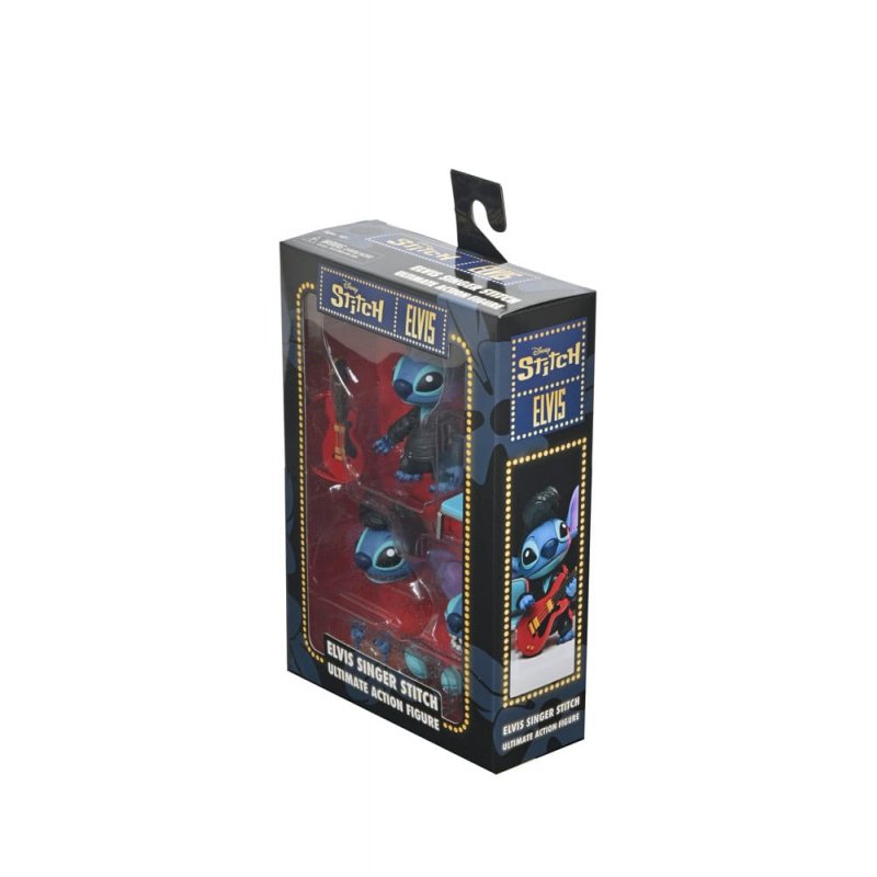 Are you ready to rock?This officially licensed creation shows Stitch dressed up in a signature Elvis looks.Your action figure ohana won't be complete without this Ultimate Singer Elvis action figure by NECA.Dressed up in a black leather outfit just like Elvis wore, this Disney Stitch articulated action figure stands over 3 inches tall and is ready to put on a show you'll never forget!Accessories include interchangeable heads, hands, hair pieces, and eye plates, plus guitar and chair.Comes in collector-friendly packaging.