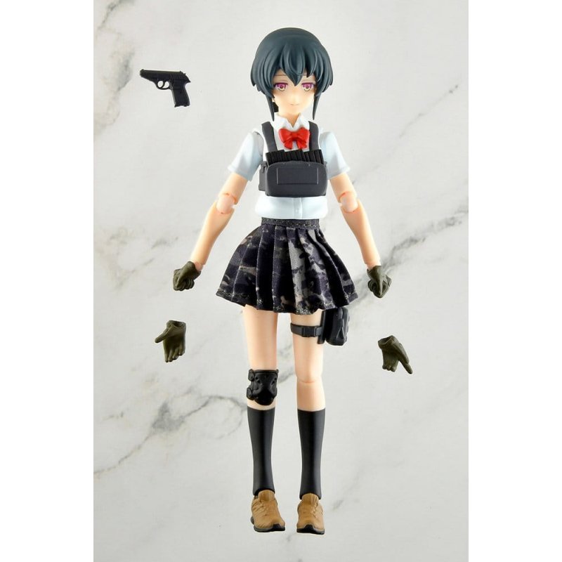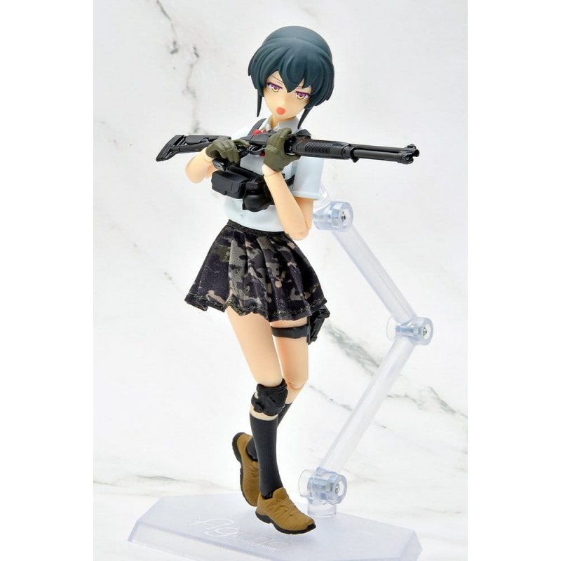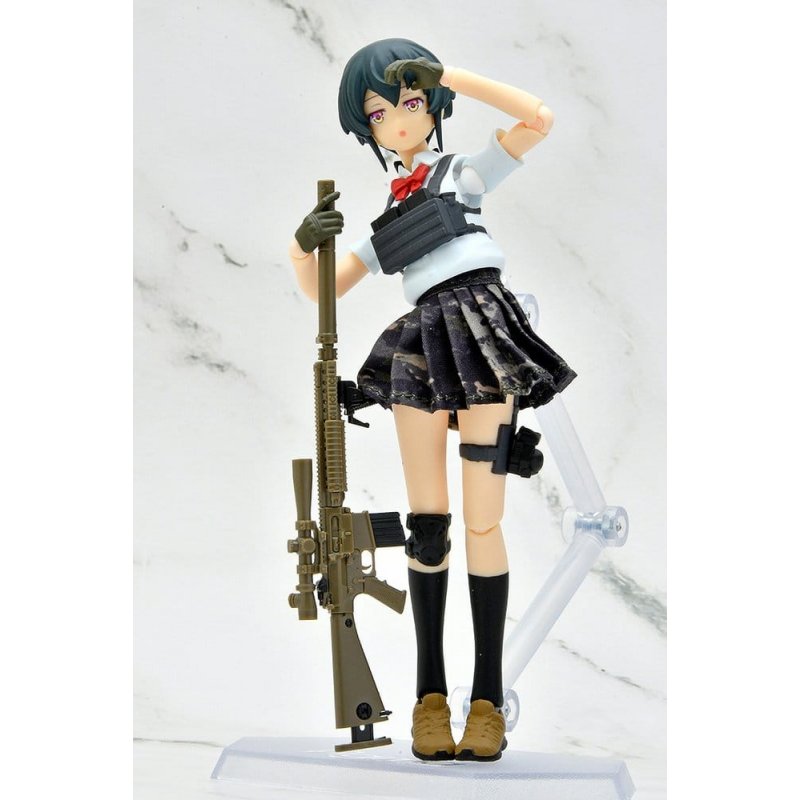 From the military high school girl series "Little Armory" comes unnamed character E in a new style! This figure includes black equipment parts and a cloth skirt with a camouflage pattern. Feautring a black equipment color scheme that is mainly used by special forces for its intimidating effect and low visibility at night. Variant E features short hair, a chest rig, and trail running shoes, making for a "low profile" configuration. Hair and eye colors have been changed, allowing you to enjoy an even greater variation of display options when paired with past entries in the series. The figure comes with a P230 type automatic pistol. *Use rubber adhesive to secure equipment as necessary. Some parts cannot be combined due to incompatible shapes and positions.