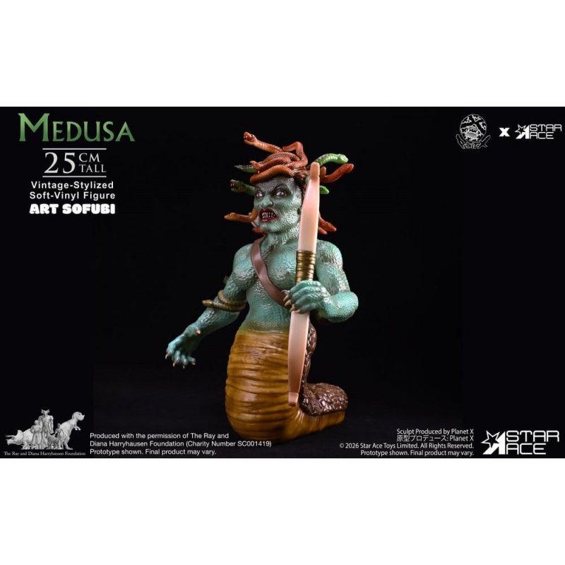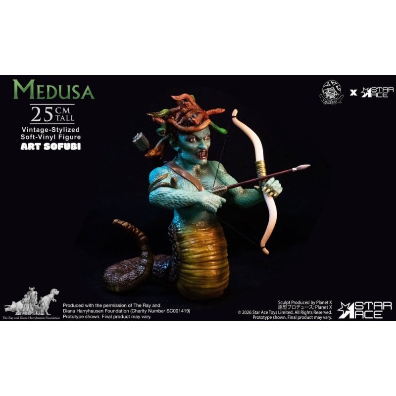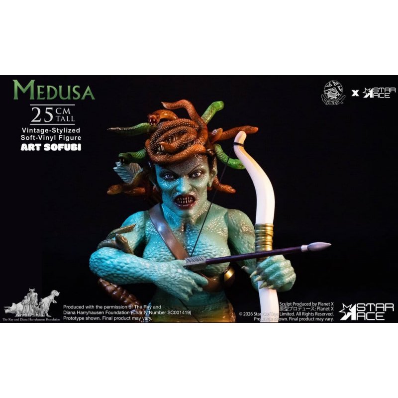 Star Ace ART SOFUBI Series: Medusa - Ray Harryhausen Collection Vintage Style. Legendary Monster. Timeless Tribute.The hunt begins! Star Ace proudly unveils the next stunning release in our vintage-style soft-vinyl figure series-the terrifying Medusa, rising from the mythic depths of the 1981 classic Clash of the Titans. Officially licensed as part of the Ray Harryhausen Collection, this serpent-haired Gorgon slithers onto your shelf in bold retro sofubi style.Designed by @planetxasia and standing an imposing 25 cm (10 inches) tall, this figure captures Medusa's sinister grace with exaggerated, characterful sculpting and a vibrant paint scheme. Every scale, snake, and stone-cold stare is rendered with a nostalgic nod to vintage Japanese sofubi toys-blending film history with collectible art.This highly poseable collectible includes a switch-out right arm for dynamic display options. Customize her stance with an open hand for a poised, stalking pose, or attach the arrow-holding hand to pair perfectly with the bow held in her left hand, completing her iconic attacking stance.Perfect for collectors of retro vinyl figures, fans of Harryhausen's legendary stop-motion artistry, and anyone who loves mythic monsters reimagined with style and soul.