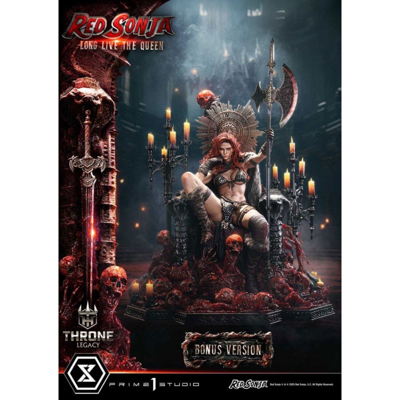 After vanquishing evil, upon the bloodstained throne- the indomitable red-haired queen realized in 1/3 scale. Unyielding will and divine combat prowess-"Red Sonja," the character who laid the foundation for female warriors in American comics, joins the Throne Legacy lineup. Created to commemorate the 50th anniversary of the character's debut, this official artwork by Ian MacDonald inspired the 1/3 scale statue titled "Red Sonja: Long Live the Queen." Victorious in a bloody battle on enemy soil, the crimson-haired warrior seizes the throne with a bold pose. Her fierce yet beautiful presence has been fully realized in three dimensions. Her iconic red hair is layered with multiple tones, designed to catch the light and reveal rich shadows. Deep eyes and freckled skin emphasize her humanity. The supple proportions combine finely sculpted muscle with feminine softness. Scale-patterned bikini armor and a greatsword evoke the weight of real metal, while the cloak and boots, finished with faux fur, capture a wild, natural texture. Every element of her gear conveys distinct materiality. The ominous throne is faithfully based on the colors and shapes of the original artwork. At her feet, the dark spawn writhe lifelessly; gothic candelabras burn with wax candles; and a massive serpent rears its head behind her. All elements serve to exalt the rise of a new sovereign. This bonus version includes an exclusive interchangeable right arm holding a long-handled axe. The heavy, engraved blade, stained with dark red blood, further highlights both the queen's regal bearing and the primal instincts of a warrior. The red-haired warrior enthroned as queen-an essential centerpiece worthy of absolute loyalty in any collection. Product Specifications: - Red Sonja-themed Base - 1 x Swappable Left Arm (Sword) - 1 x Swappable Left Arm (Axe) [BONUS PART] Limited Edition of 600 pcs worldwide.