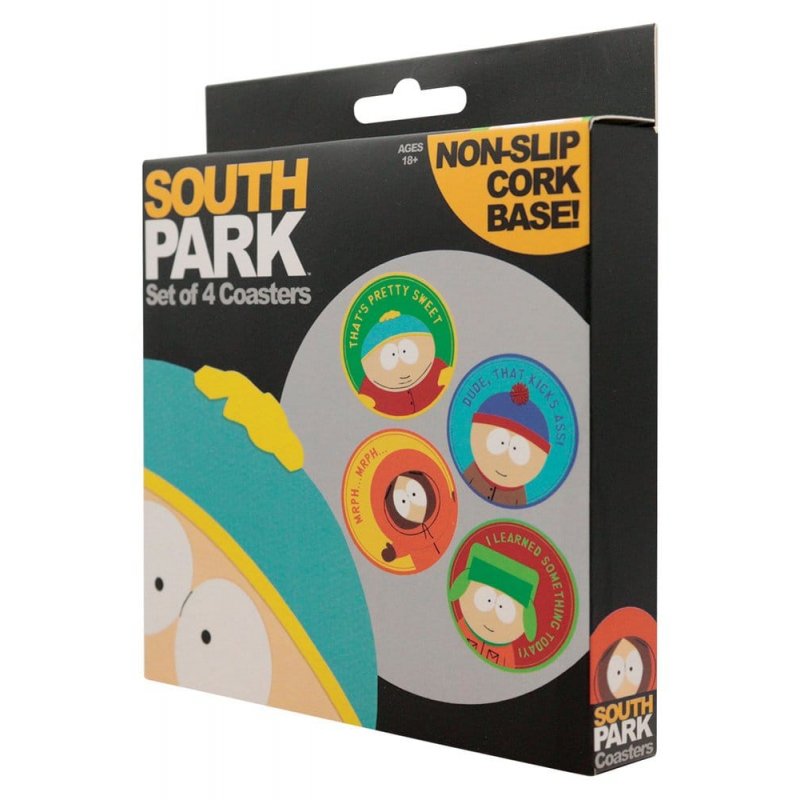 The original four: Cartman, Stan, Kyle, and Kenny, all feature on this officially licensed set of four drinks coasters. It's an essential set of barware for fans of the foul-mouthed foursome! On the bottom is an anti-slip cork base, and on top is a tin surface printed with artwork depicting the characters and a quote.Each coaster measures 89 mm in diameter.
