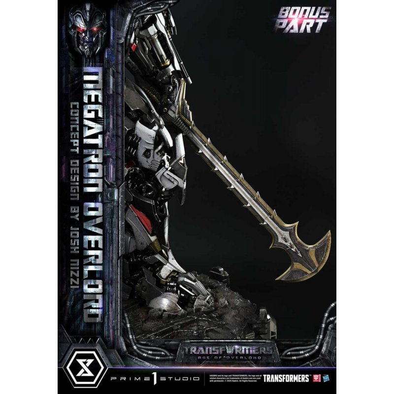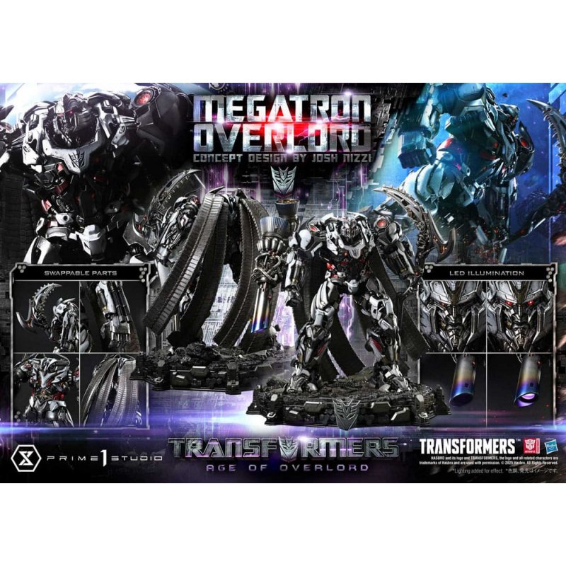 Clad in platinum's noble glow, a new Decepticon Overlord descends Welcoming renowned designer Josh Nizzi as mechanical concept artist, we present an original entry in the Transformers series. Joining this lineup is "Megatron Overload." Standing opposite the already-released hero "Powermaster Optimus Prime"-known for his overwhelming firepower and mobility-this new figure brings to life his formidable rival. With a beastlike forward-leaning posture and feet planted firmly into the ground, his massive, commanding stance evokes a moment from the battlefield. Every limb and core section has been precisely engineered to create a silhouette of unshakable authority. A massive scythe features a chainsaw-like blade, while internal mechanisms hint at a hidden vehicle mode. Josh Nizzi's intricate mechanical styling is faithfully translated into every detail of the sculpt. What defines this piece above all is the platinum finish of its outer armor-a noble sheen that shines through even the most intense weathering. Piercing red eyes and a fusion cannon that glows with destructive purple energy-each LED accent is carefully tuned to enhance the character's presence. Adding further gravitas is the Crawler Cape, composed of interlinked treads. Together with the swappable open left hand, it allows for expressive posing that conveys a wide range of emotions. And the final, fearsome touch-a cursed greatsword, exclusive to the Bonus Version. Its crescent-shaped tip and jagged spine summon forth the figure's darker side, revealing the face of a merciless executioner. A new Decepticon Overlord rises within the Transformers multiverse. Let this platinum-draped masterpiece become the crown jewel of your collection. Product Specifications: - Transformers-themed Base - 1 x Crawler Cape - 2 x Swappable Left Hands (Scythe, Open Hand) - LED Light-Up Features (Eyes, Fusion Cannon) - 1 x Swappable Left Hand (Greatsword) [BONUS PART] LED Power Supply Method: TBD * Please prepare batteries, USB cables, or other necessary items depending on the final power supply method.
