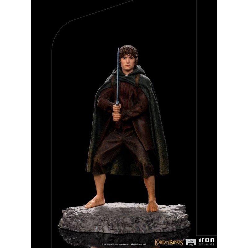 With its blade glowing blue, the elven sword named Sting announces the approach of a battalion of Orcs bringing a fearsome cave Troll. Wielding the weapon with his small hands, the brave Hobbit prepares for the battle alongside his friends and guardian allies from the Fellowship of the Ring, cornered in the tomb mausoleum of Balin, the Dwarf lord, on a pedestal depicting the petrified floors of the Moria. With attention to details and faithful precision to the face features of actor Elijah Wood, Iron Studios presents the statue "Frodo - BDS - The Lord of the Rings - Art Scale 1/10", part of a diorama set that replicates the emblematic battle featured in the movie "The Lord of the Rings: The Fellowship of the Ring", adapted into a film by Peter Jackson in 2001.Frodo Baggins is a Hobbit from the Shire in Middle-earth, Tolkien's most renowned protagonist for his main part on the Quest of the Ring, in which he took the so called "One Ring" to be destroyed in Mount Doom in Mordor. Frodo was adopted by his uncle Bilbo and started living with him, inheriting the same ring called "One Ring" and the mission to destroy it. Best friend of gardener Samwise Gamgee, creator of the group known as The Fellowship of the Ring that in its journey crossed the deep halls of the underground complex of Moria, facing many dangers.Made in polystone *(may contain parts in resin, polystone, PVC, metal and fabric)Size: 12 x 9 x 7 cm
