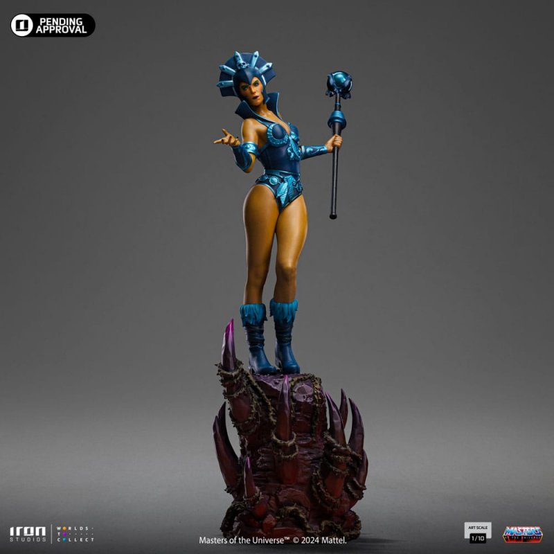 Eternia's fearsome witch gets a variant statue from Iron Studios! Wielding her mystical scepter in her left hand, the feared witch conjures her magic, serving as the right hand of an evil sorcerer, being the most powerful and intelligent among his partners and minions. She watches her goal with cold and calculating eyes, hoping to harness her master's powers and one day rule planet Eternia. Dressed in her classic original costume in shades of matte and metallic blue, with her head protected by a helmet in the shape of a crown in the colors of her attire, Iron Studios presents the variant statue "Evil-Lyn Color Variant - MOTU - Art Scale 1/10" with the most feared villain among the evil warriors, enemy of He-Man and the Masters of the Universe, with a yellowish skin tone like her original figure, on a base in the shape of a crimson rocky totem, surrounded by claws sprouting from its interior where thorny vines wrap around in a typical set of her evil lair in the Snake Mountain. Fiercely ambitious and often working independently of her master, the ruthless sorcerer Skeletor, creating her own schemes to conquer the planet Eternia, for which she occasionally recruited other henchmen, Evil-Lyn can teleport, fire magical blasts from her hands and eyes, control minds, and conjure storms, in addition to being very skilled in disguise, often deceiving the heroic warriors. Daughter of the powerful sorcerer called Faceless One, she met the warlord Keldor in her youth, with whom she forged an alliance. When he was severely injured fighting Captain Randor in the Hall of Wisdom, Evil-Lyn took Keldor to Hordak's Sanctuary and witnessed his transformation into Skeletor. Despite her discomfort, Evil-Lyn continued to loyally serve Skeletor as second in command but had always hinted that she would one day usurp his position. Presented on the Inside Iron Studios Day of May, Evil-Lyn Color Variant expands Iron Studios' MOTU statue line along the others previously presented statues such as Hordak Comics, Anti-Eternia He-Man, Teela Warrior Goddess, and Trap Jaw, which much more than a distinct paint job, presented a completely new configuration of the characters! Already available for Pre-Order, check out more Masters of the Universe news from Iron Studios soon! Size: ca. 28 cm