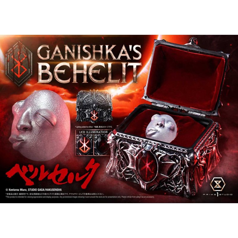 An emblem of the Law of Causality that empowered the Dread Emperor.Encased in a skull-shaped box, realized in life scale.The Law of Causality-a force that governs those who walk the mortal world and even those who dwell in the astral. Ganishka's Behelit, a symbol of this core theme of ""Berserk"", now joins the Life-Scale Masterline series.The enigmatic object that granted the Dread Emperor the power of thunderclouds has been realized as a life-sized collector's item. Its color-never formally defined until now-has been given a mystical silver finish under the supervision of Studio Gaga. Subtle distortions and irregular textures, as depicted in the manga, are fully captured in the sculpt, and its imposing form seems to faintly harbor a presence of life.The skull-shaped box that houses this piece is an original Prime 1 Studio design, inspired by motifs closely associated with the Skull Knight-skulls, swords, and curling rose vines. Velvet-like fabric lines the interior, while an LED-lit Brand of Sacrifice offers a glimpse into the abyss.A life-scale tribute to Ganishka's Behelit. Crafted with precision to satisfy the deepest cravings of your collection. - Special Box with LED Illumination - Ganishka's BehelitLED Power Supply Method: TBD* Please prepare batteries, USB cables, or other necessary items depending on the final power supply method."Product Size: 8 x 7 x 8 cm Special Box: 14 x 20 x 18 cm