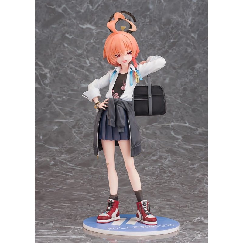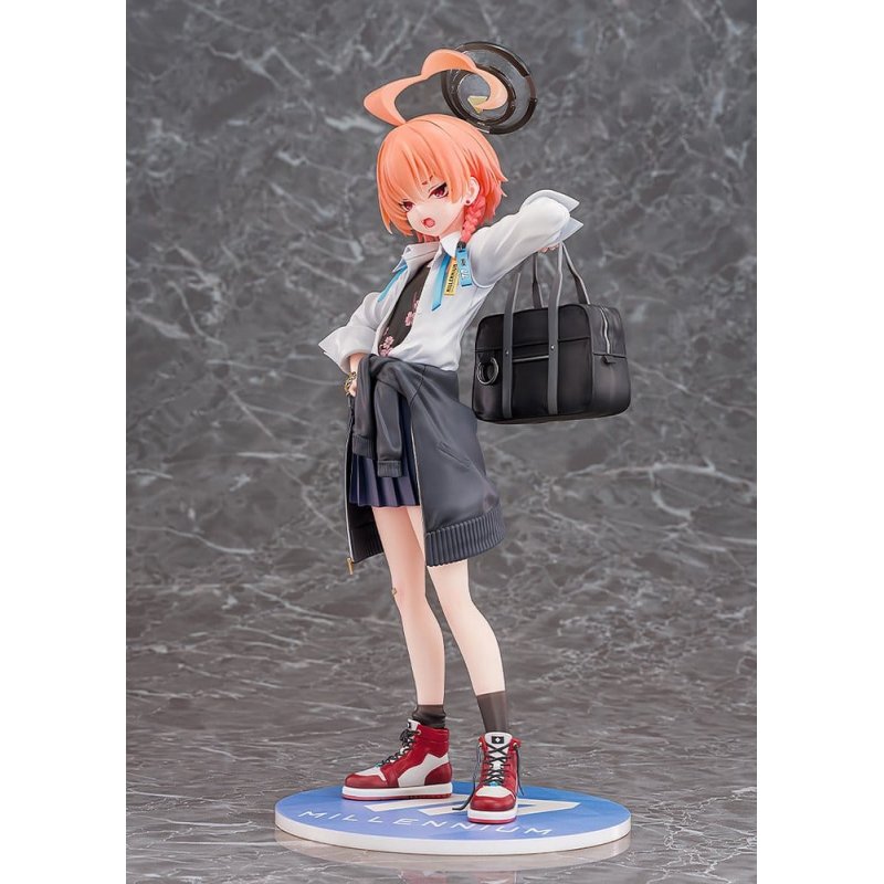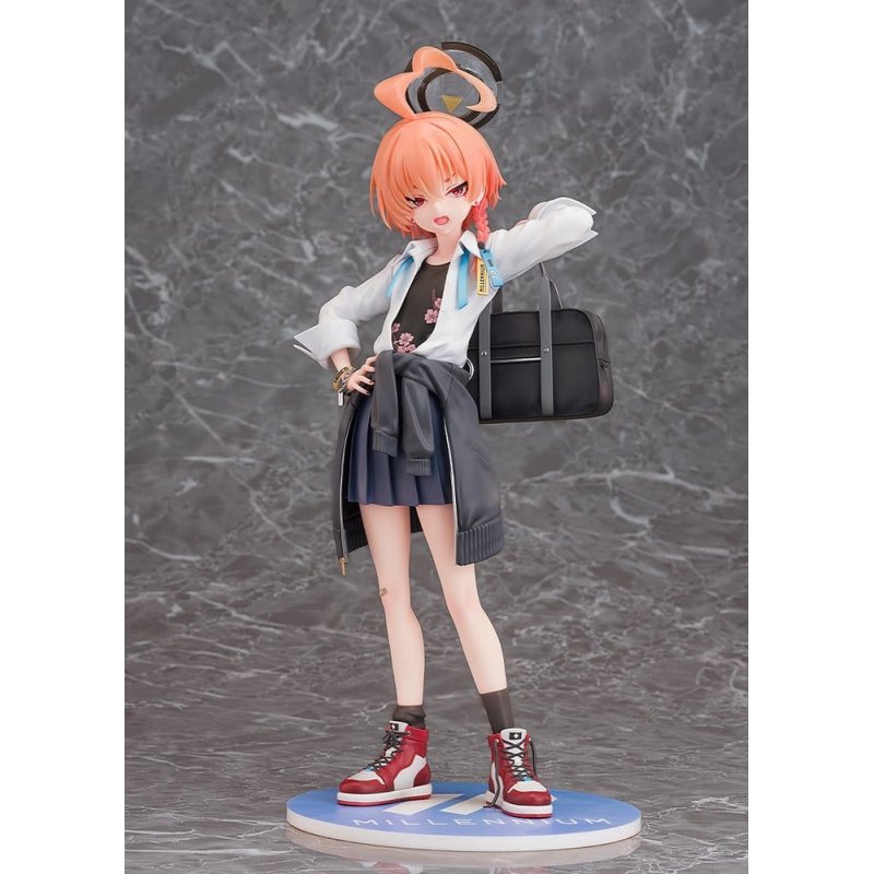 From the popular game "Blue Archive" comes a 1/7 scale figure of Neru Mikamo, the leader of Millennium Science School's intelligence agency, C&C! Neru has been captured in figure form wearing her school uniform, a refreshing change from her usual souvenir jacket and maid uniform style! Details such as her casual styling of her blouse, pleated skirt and school bag slung over her shoulder, as well as her haughty expression have been faithfully brought to life. Her trademark hairstyle has also been carefully recreated, highlighting her intense yet adorable charm. Neru's outfit, down to the texture and details of her sneakers, accessories and bag, have been meticulously translated to figure form to retain her student-like charm from the original illustration. An interchangeable confident face plate is also included for a different display option.