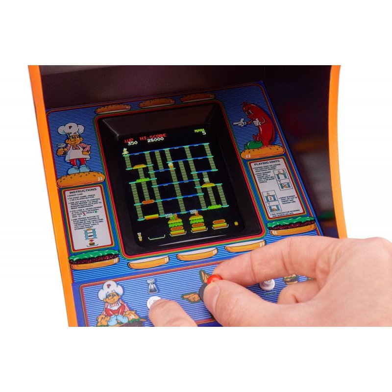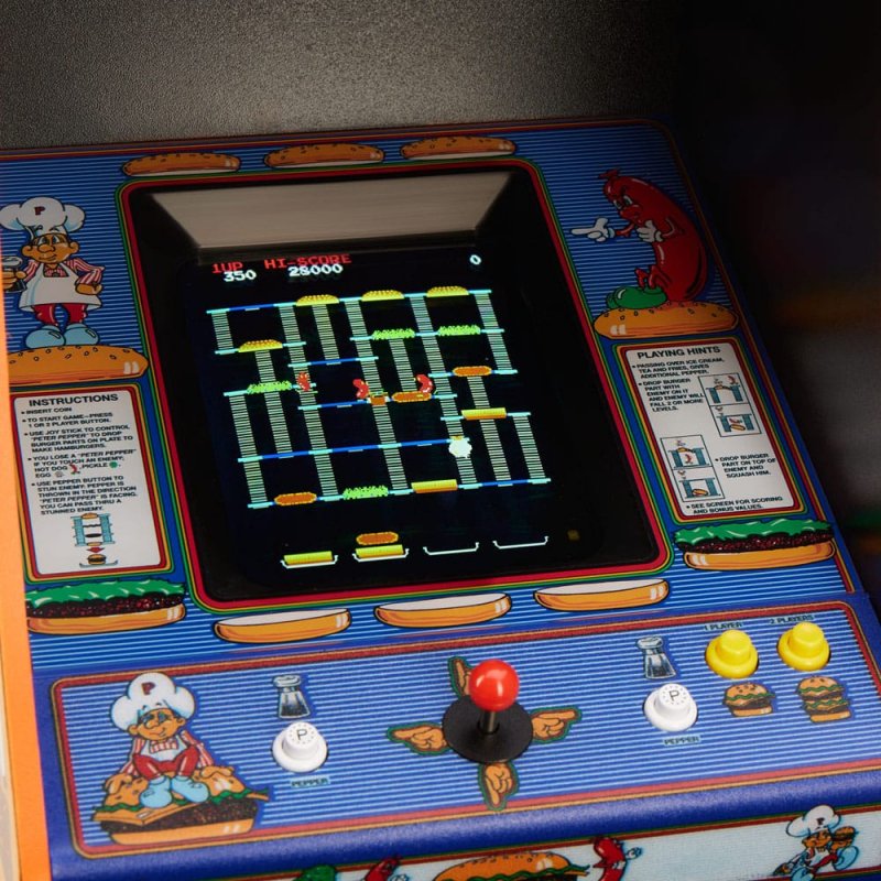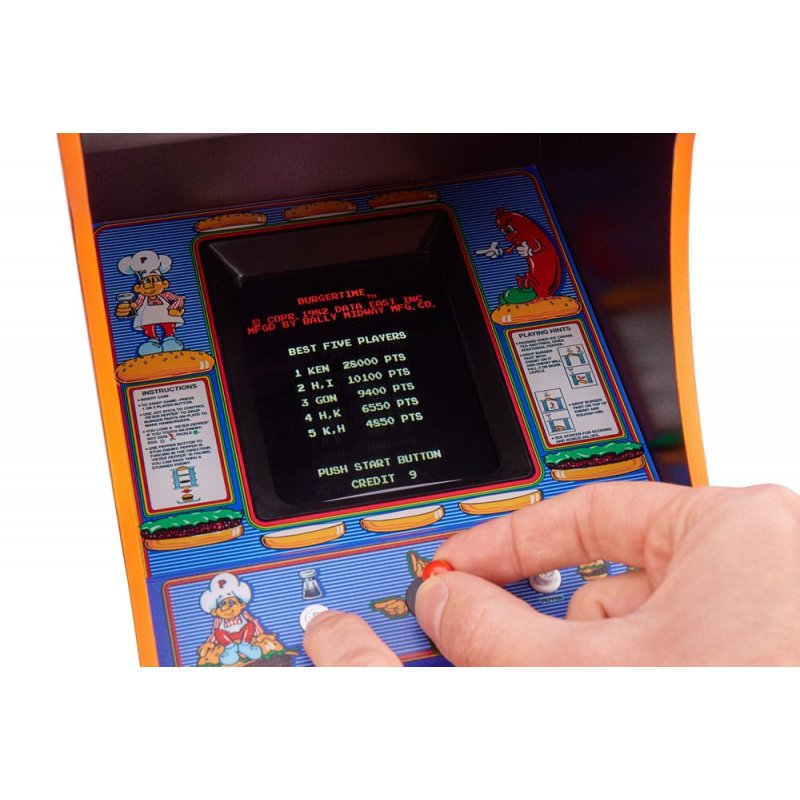 Take a nostalgic journey to the 1980s and relive the golden age of arcade gaming with Data East's beloved culinary classic, BurgerTime - beautifully recreated in quarter scale by Numskull Designs for your gaming pleasure.Armed with your trusty pepper spray, your goal is to guide chef Peter Pepper around the various levels, constructing burgers as you go and evading enemies like Mr. Egg, Mr. Hotdog, and Mr. Pickle!Constructed using real wood, with features including illuminated marquee and coin doors - every aspect of the original arcade machine has been recreated in order to give collectors and fans the chance to experience the ultimate home version of this classic arcade game.Whether in your home, office or anywhere you want to play and display the machine, it's time to master the art of the perfect burger assembly - the perfect retro gift for the friends and family members who love playing vintage video games!- Official Data East product: quarter scale wooden replica of the original BurgerTime arcade cabinet launched in 1982 - Authentic replica including original side art, buttons, 4-way joystick, illuminated marquee and coin doors - Immerse yourself in the action - fully playable cabinet utilizing the original arcade game ROM running on a bespoke emulator - DIP switch access from the classical game ROM for various game settings to enhance your gaming experience - Saves high scores - compete against family and friends for the top spot! - Crafted with high-quality materials for durability and playability - 5"TFT screen - 3W built-in speaker with volume control - Powered via USB-C (cable included) - Equipped with an internal rechargeable lithium battery for true portability - Dimensions: Height: 17.4" (44cm) x Width 6.2" (15.8cm) x Depth 8.5" (21.6cm)