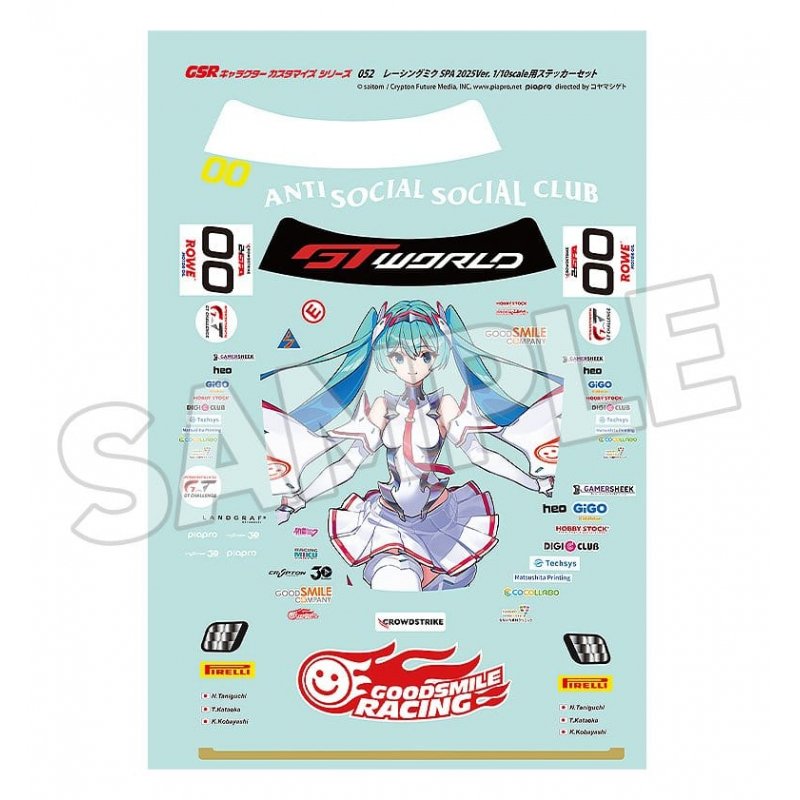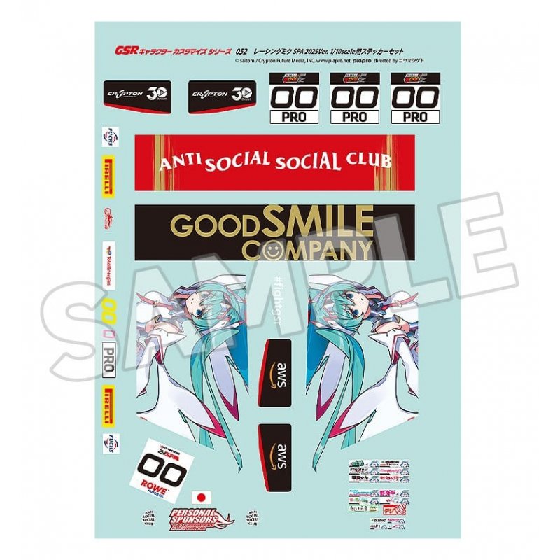 Introducing a Hatsune Miku Racing Ver. SPA 2025 set of GSR character customization stickers perfect for 1/10 scale radio-controlled cars! Both the 24 Hours of Spa-Francorchamps and Suzuka 1000km versions can be recreated. Not only do the stickers allow you to recreate the GT car, they are a perfect item for Racing Miku fans who need even more Miku in their lives! The stickers are weather and fade-resistant. The material is made to be easy to stick to curved surfaces. Made in Japan. *This product is a GSR point item. https://www.goodsmileracing.com/sponsors/point/