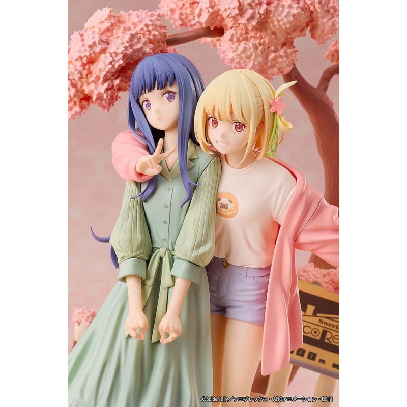 Presenting a figure based on the jacket illustration from the "Lycoris Recoil" TV anime Blu-ray and DVD release! The figure cutely recreates Chisato happily putting her arm around Takina, with the reserved Takina making a peace sign. The illustration's symbolic cherry blossom tree and signboard are also reproduced on the figure's base. With its spring-like atmosphere, this is a figure that can be enjoyed from any angle.