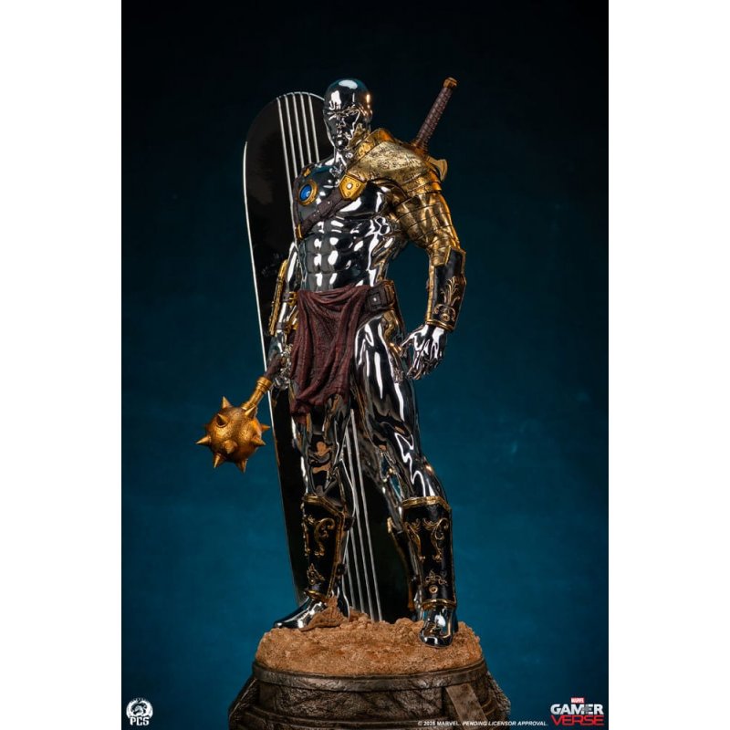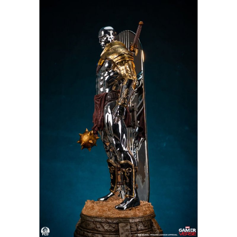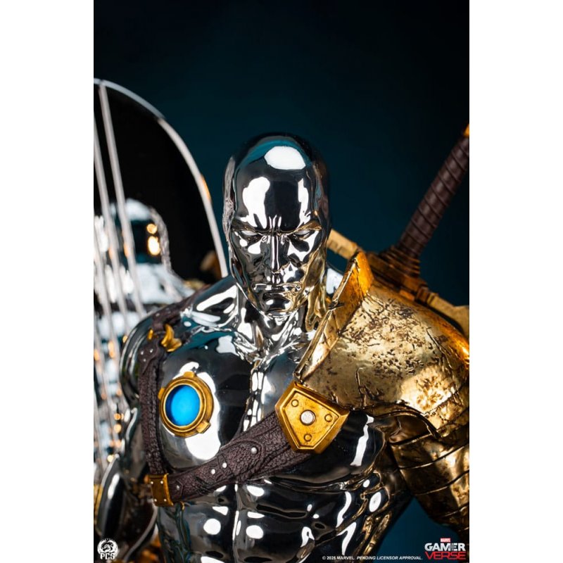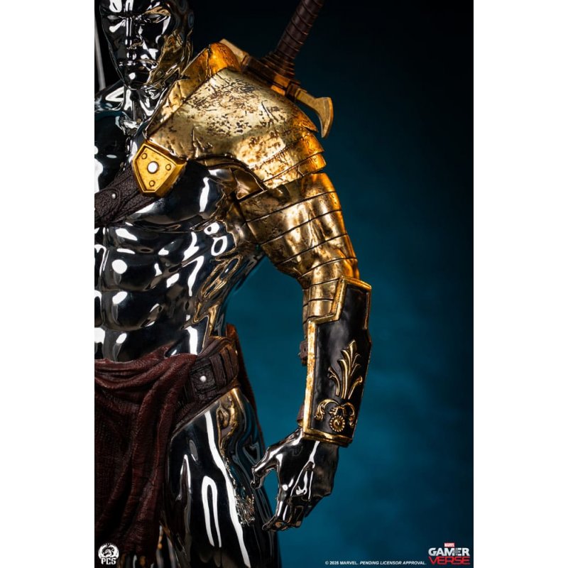 Premium Collectibles Studio proudly presents the Silver Surfer - 1:3 Scale Statue, inspired by the interstellar herald's gladiator variant in the smash hit mobile game, Marvel Snap!Standing an impressive 30.5" tall, this beautiful collectible captures the stoic intensity of the Silver Surfer armed to battle against his will, (thanks to the blue control disc fixed to his chest) in the fighting pits of Sakaar. This popular rendition of the classic Marvel character is decked out in an assortment of armor and weapons cobbled together from the arena's makeshift arsenal.The bulky bronze pauldron on his left shoulder is pitted with damage and connects to an array of straps that also acts as a sheath for the massive great sword on his back. His ornately decorated gauntlets and greaves, along with a reddish-brown loincloth give this galactic traveler a distinctly Roman look, fitting for the massive arena he's held captive in.The Silver Surfer himself is covered in a dazzling, reflective chrome finish from head to toe. The finish appears even brighter when set against the battle worn armor and weapons he is adorned with. In his right hand he wields a spiked mace while behind him his iconic surfboard, fashioned into a makeshift shield, juts out from the base which has been sculpted with a realistic sand-like texture to recreate the feel of the harsh terrain.Set a course for adventure and add the Silver Surfer 1:3 Scale Statue by PCS to your Marvel Gamerverse collection today!Limited Edition: 250 PiecesSize: 77 x 39 x 32 cm