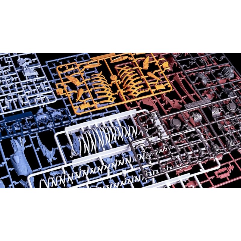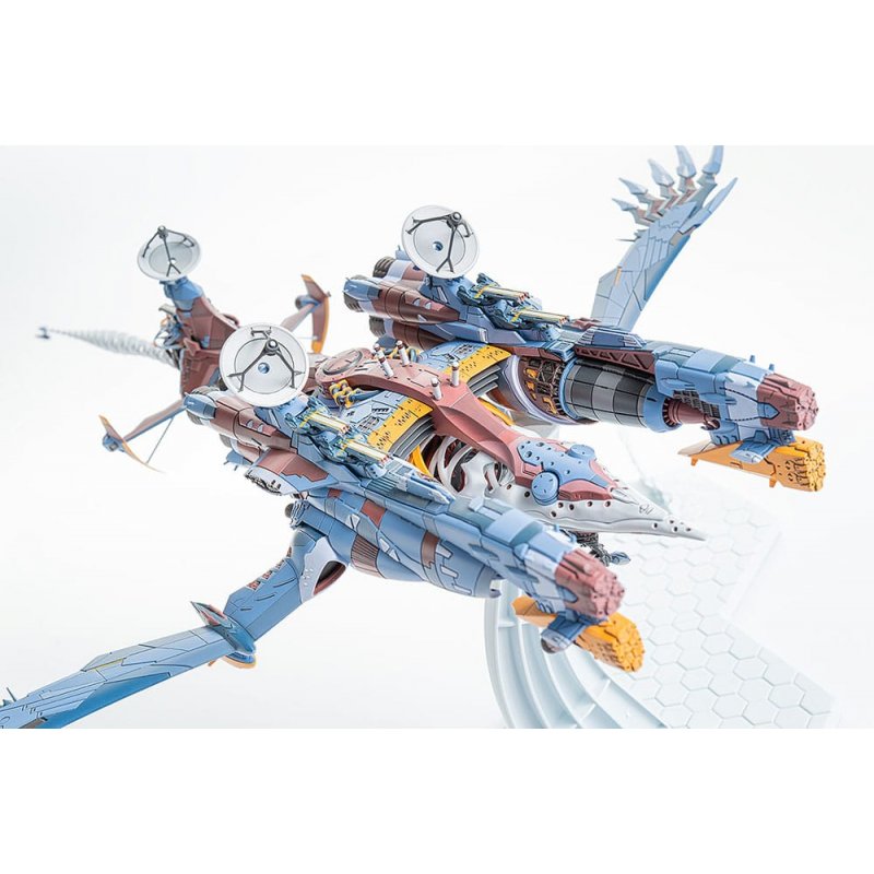 From "Rebuild of Evangelion" comes a plastic model of AAA Wunder, WILLE's main aerial battleship. The model kit is about an impressive 509mm in length and 406mm in width, and packed with details and intricate sculpting. The various parts of the mecha have been separated into nine different colored runners, making it easy to recreate the battleship with a simple assembly. The main armament and antennas are articulated. The rib-like white structures and complicated piping allow for a clear view of the main engine contained within. The dedicated display base allows the battleship to be displayed in either horizontal flight mode or advancing while breaking through the L-Barrier boundary with deep rolls. The main wings and left/right fuselage sections are designed to be removable even after assembly, allowing for easy display and transport.