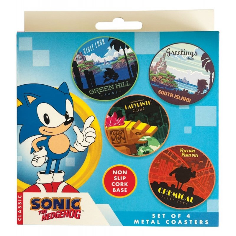 "South Island, Chemical Plant Zone, Labyrinth Zone, and of course, Green Hill: all iconic locations in the world of Sonic the Hedgehog, and all represented in this set of printed coasters. Made out of tin with a non-slip cork base, each coaster measures 89mm in diameter.- 4 unique coasters - Officially licensed - 89mm diameter - Metal surface with printed colours - Non-slip cork base"