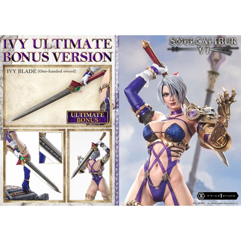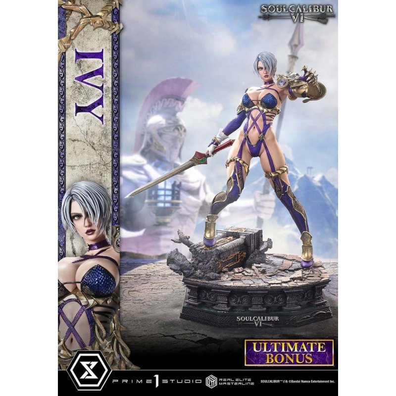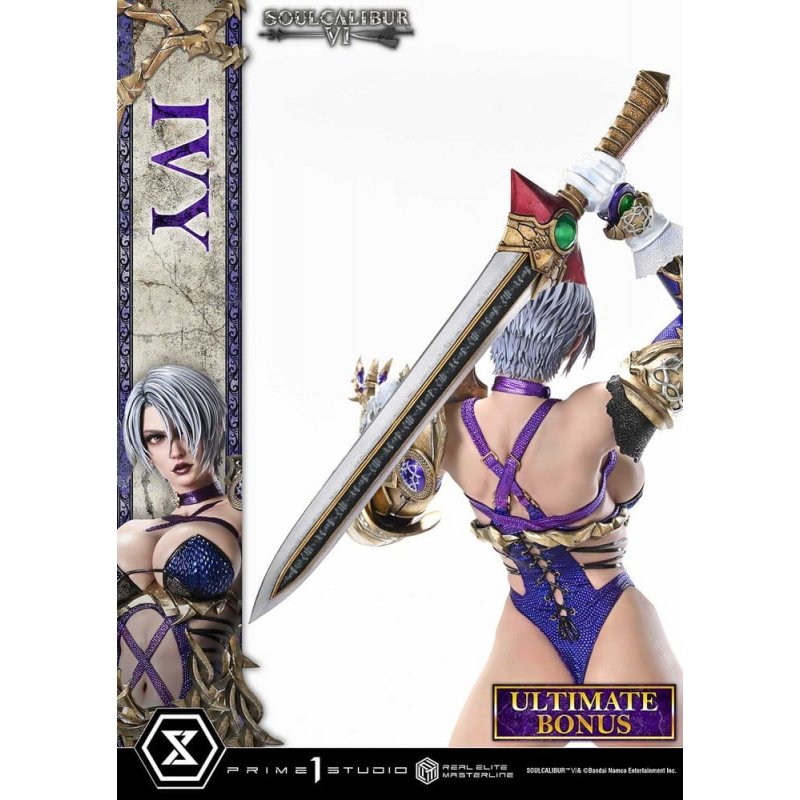 "Your punishment will be quite severe." The Twisting Blade of Solitude is brought to life in realistic 1/4 scale. With a reboot that reinvigorates the series, "SOULCALIBUR ?" is a weapon-based fighting action game that boasts top-tier gameplay and stunning visuals. From this installment, IVY joins the Real Elite Masterline lineup. An adopted daughter of the prestigious Valentine family, she vows to destroy the cursed blade and follows a fateful path. This is a 1/4 scale piece that captures her grace and swordsmanship. Inspired by the character visual, her pose has her brandishing the whip-form magic sword, the IVY Blade. From the twist of her torso to the weight placed on her right foot as she steps down, every detail was meticulously engineered to create an elegant sense of dynamism. The flowing strands of her supple silver hair, the intricate patterns in her irises, the sheen of wet lipstick. Her refined facial features bring the game’s look to life with realism. From a physique that balances femininity with strength to a costume finished with careful attention down to the nuances of purple, every detail delivers a richly detailed finish. The special base is inspired by the "Shrine of Eurydice: Cloud Sanctuary." Its design, drawn from one of the series’ most iconic stages, heightens immersion in the world of the game. A swappable upper body that swings the whip back and taunts with a beckoning hand. A swappable head that curls into a confident smile. Additional parts to change the tone of your display are also included. Combine them with the Background Stand and Bust Stand to stage her heroic figure exactly as you like. And this Ultimate Bonus Version includes one-handed sword-form blades. These special parts convey the essence of her Unrelated Link style, which weaves Western swordsmanship and Eastern whip techniques together in battle. The Twisting Blade of Solitude arrives in realistic 1/4 scale. Refined sculpting and painting techniques will stir your soul.Product Specifications: - 2 x Swappable Heads (Serious, Smiling) - 2 x Swappable Upper Bodies (A: Sword Held Downward, B: Sword Raised) - 2 x Whip-form Sword Blades (For Upper Body A, For Upper Body B) - 1 x Background Stand - 1 x Bust Stand - 2 x One-handed Sword-form Blades (For Upper Body A, For Upper Body B) [Bonus Parts]* Limited to 400 pieces worldwide.