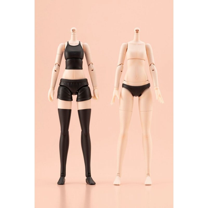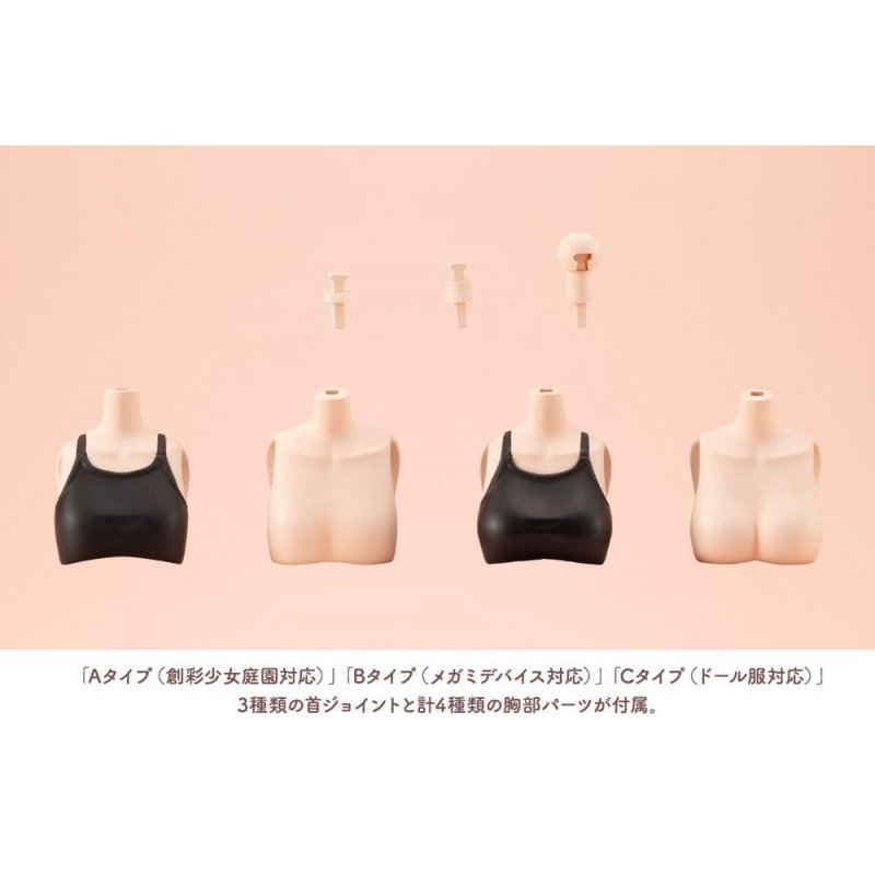 "The outfit color has been changed to black, and the skin tone to skin color C. Have fun dressing the doll up in all kinds of outfits ? The set comes in two variations; in loungewear and innerwear. Choose between the slender or regular chest types and assemble the model as you see fit. The simple and highly posable design makes this a great model to use as a base for modification.Product Highlights!Two Body TypesThe set includes two models with different body types. *The set does not include any SOUSAISHOJOTEIEN heads. *The model is designed to reach 140mm in height with a SOUSAISHOJOTEIEN head. The loungewear body wears a short camisole tank top and shorts, ideal for settings like relaxing at home. The innerwear body has been designed for the Tiny Closet set (Kotobukiya Shop exclusive, sold separately) and other 14cm doll clothes. *Note that clothes other than the specifically designed Tiny Closet lineup may not fit the model depending on their size. This kit is a little smaller than the M size model and is compatible with an even wider range of outfits.Two Chest Sizes The slender type chest is designed after Emma Koishikawa, and the regular type for general use. Two sets of each are included for customization.Different Length Neck Joints The set includes three types of neck joints: Type A (for SOUSAISHOJOTEIEN), Type B (for Megami Device), and Type C (for regular doll clothes). Type B has a slightly longer neck than Type A to support use with Megami Device heads. Type C has an even longer neck than Type B to prevent it from being hidden under any clothing. In addition, the set includes two types of ball joints: 5mm and 6mm. The 5mm type is compatible with SOUSAISHOJOTEIEN, ARCANADEA, Frame Arms Girl, and Megalomaria Unlimited Universe models, while the 6mm type is compatible with Megami Device models.Sliding Neck Joint The neck joints have the forward and back sliding feature from Koyomi Takanashi?Swim Style?, allowing for dynamic vertical movement such as tucking in the chin and looking up. It can be used to prevent hair parts from getting in the way of articulation.Different Length Socks The set comes with three types of interchangeable calf parts and socks: short socks, high socks, and thigh-high socks. The same thigh parts apply for both the legs with short socks or with high socks.Material Colors The body uses Skin Color C, which is used with YOMI?Black Canvas?, Emma Koishikawa?ST. IRIS GAKUEN GIRLS' HIGH SCHOOL SUMMER CLOTHES?DREAMING STYLE WONDERLAND PRINCESS, Emma Koishikawa?ST. IRIS GAKUEN GIRLS' HIGH SCHOOL WINTER CLOTHES?DREAMING STYLE IMPERIAL ROSE, Ritsuka Saeki?Swim Style?Hair Arrange Ver., and Eimi Nijimura?RYOBU HIGH SCHOOL SUMMER CLOTHES?DREAMING STYLE ROMANTIC MEMORIES, KUON YAKUSHIJI?MARIA KAGARIBI COSTUME?, Kuon Yakushiji?TOUOU HIGH SCHOOL UNIFORM?, making it easy to customize with the models.Included Items:- 1 x Loungewear Body - 1 x Innerwear Body - 1 x Chest Part (Slender) Loungewear - 1 x Chest Part (Slender) Innerwear - 1 x Chest Part (Regular) Loungewear - 1 x Chest Part (Regular) Innerwear - 1 x Short Sock Leg Parts × Left/Right - 1 x High Sock Leg Parts × Left/Right - 1 x Thigh-High Sock Leg Parts × Left/Right - 1 x Bare Foot Parts × Left/Right - 7 x Types of Hand Parts: Holding (Standard), Holding (Narrow), Holding (Wide), Holding (Round), Closed, Pointing, Open) × Left/Right Each (Note that only one pair of each is included, which means the loungewear and innerwear bodies cannot be displayed with the same type of hand parts simultaneously.) - 1 x Neck Joint Type A Loungewear - 1 x Neck Joint Type A Innerwear - 1 x Neck Joint Type B Loungewear - 1 x Neck Joint Type B Innerwear - 1 x Neck Joint Type C Loungewear - 1 x Neck Joint Type C Innerwear - 2 x 5mm Neck Ball Joint - 2 x 6mm Neck Ball Joint - 1 x Additional [Skin Color C] Ankle Joint × Left/Right (Interchangeable with sandals and ankles included in Ritsuka Saeki?Swim Style?Hair Arrange Ver.) - 1 x Optional Ankle Joint [White] × Left/Right (Can be combined with shoes and ankles from Emma Koishikawa's uniform models.)"