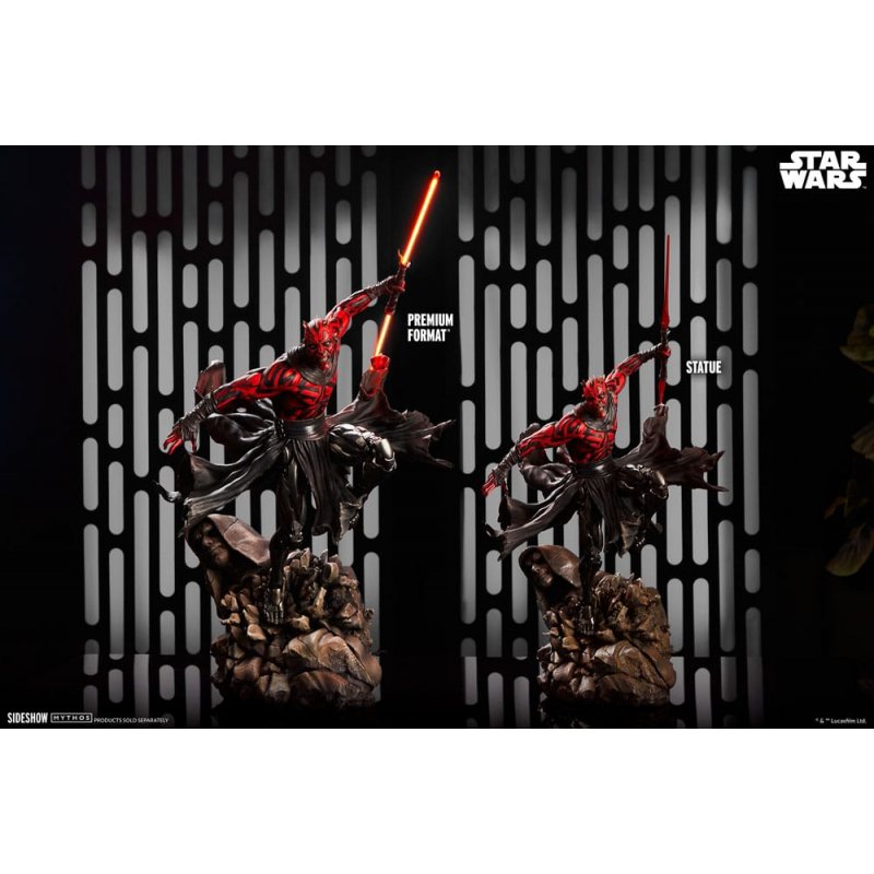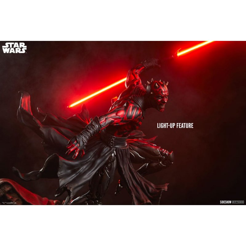 "You will remain alive only so long as you're of use to me!"Sideshow presents the Darth Maul™ Mythos Premium Format™ Figure, an officially licensed Star Wars™ collectible bringing this character's revenge to an incredible new scale.Sideshow's Mythos series features fine art collectibles that allow the collector to imagine what could have been, but maybe never was. Myths meant to be initiated by the eye and completed by the mind. This quarter-scale presentation explores Maul's years as a forgotten, phantom disciple of the dark side.The Darth Maul™ Mythos Premium Format™ Figure measures 25.39 inches (64.5 cm) tall, 16.54 inches (42 cm) wide, and 27.55 inches (70 cm) deep as this hateful Zabrak warrior leaps from the crumbling remains of a Sith temple. Ready to cut down his enemies, Darth Maul wields his famed dual-bladed red lightsaber. His savage rage and loathing for the accursed Jedi help him carve a path through the galaxy toward their utter ruin.This polystone Darth Maul collectible features a fully sculpted costume composed of weathered black skirts, belts, arm wraps, and a black collar. As a result of his fateful duel with Obi-Wan Kenobi, the Dathomirian villain now has powerful, highly detailed robotic legs that allow him to hunt his prey with animalistic precision. Darth Maul's portrait shows a grimace and short horns, and he is also covered in customary Zabrak markings, creating his signature red and black appearance. This dynamic Star Wars statue includes a light-up saber, illuminating Maul's enmity from every angle.No mercy, no compromise. Bring home the Darth Maul™ Mythos Premium Format™ Figure by Sideshow today!