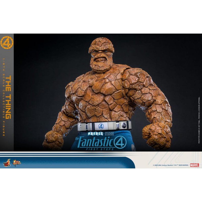 Welcome to the family. Marvel Studios is set to introduce its First Family in Fantastic Four: First Steps, a stylish, 1960s-inspired reboot that blends retro-futurism with thrilling superhero adventure. As they face cosmic threats like Galactus and the Silver Surfer, the team balance their roles as heroes with the strength of their family bond. Among the them, Ben Grimm, aka The Thing, is brought to life by Ebon Moss-Bachrach, whose portrayal emphasizes not only the hero's immense strength but also his deeply human side. Ben's transformation into the rocky-skinned powerhouse, while maintaining his loyalty, heart, and sense of humor, keeps him as Marvel's favorite "ever-lovin', blue-eyed" hero.Sideshow and Hot Toys is proud to present the The Thing Sixth Scale Collectible Figure. The figure features a rock-like textured body. It also includes two interchangeable head sculpts, one normal version and one bearded version, both with rolling-eyeball function and texture that captures his iconic rock-like form. He wears the Fantastic Four uniform tailored in blue and white ribbed fabric, with the upper part of the suit being removable, allowing collectors to display The Thing in his classic bare-chested look. Completing the outfit is a belt bearing the Fantastic Four emblem and a pair of boots. The figure comes with six interchangeable hands, including fists, relaxed hands, and claw gesture hands for dynamic posing. Presented on a specially designed figure base, he's ready to clobber!Complete your Fantastic Four: First Steps lineup by adding The Thing to your collection, because no team is truly fantastic without its powerhouse.