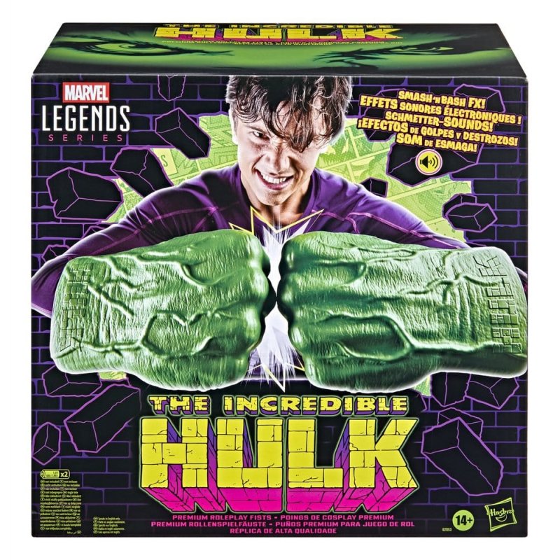 Hasbro Marvel Legends proudly presents this 1:1 scale electronic Hulk hands with Smash 'N Bash Sound FX! Roleplay firsts with premium design and deco features 13 sounds and phrases which activate when you shake the fists, punch the air, or hit a hard surface. Marvel roleplay set is fun for playtime and is great for displaying in fans' collections. Can also be worn with a Hulk Halloween costume or Marvel cosplay for fans ages 14 and up. Imagine gearing up as the jade giant! Bring comic-inspired scene to life with Marvel Legends action figures, roleplay gear, and collectibles. (Each sold separately. Subject to availability.)2 X 1.5V AAA ALKALINE BATTERIES REQUIRED. Not included.