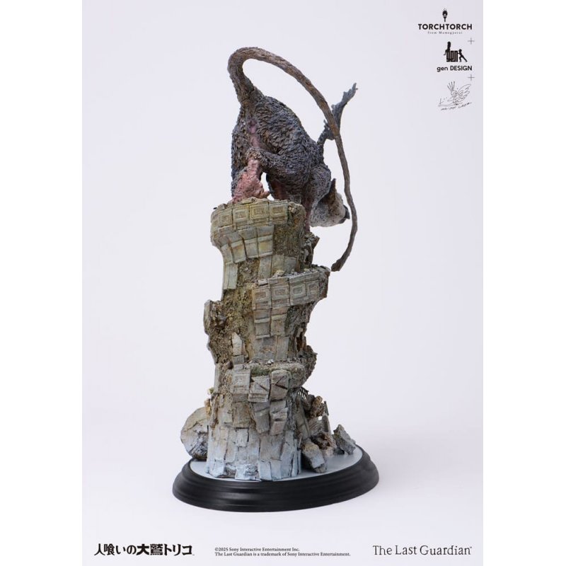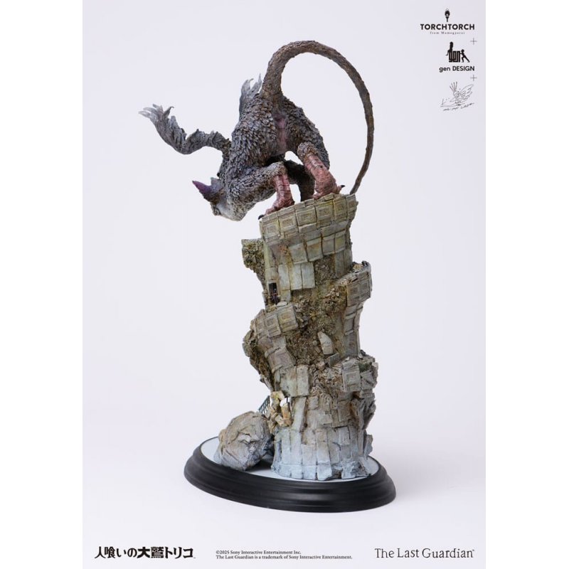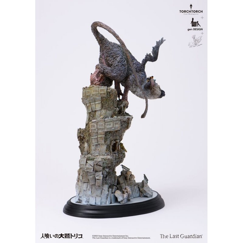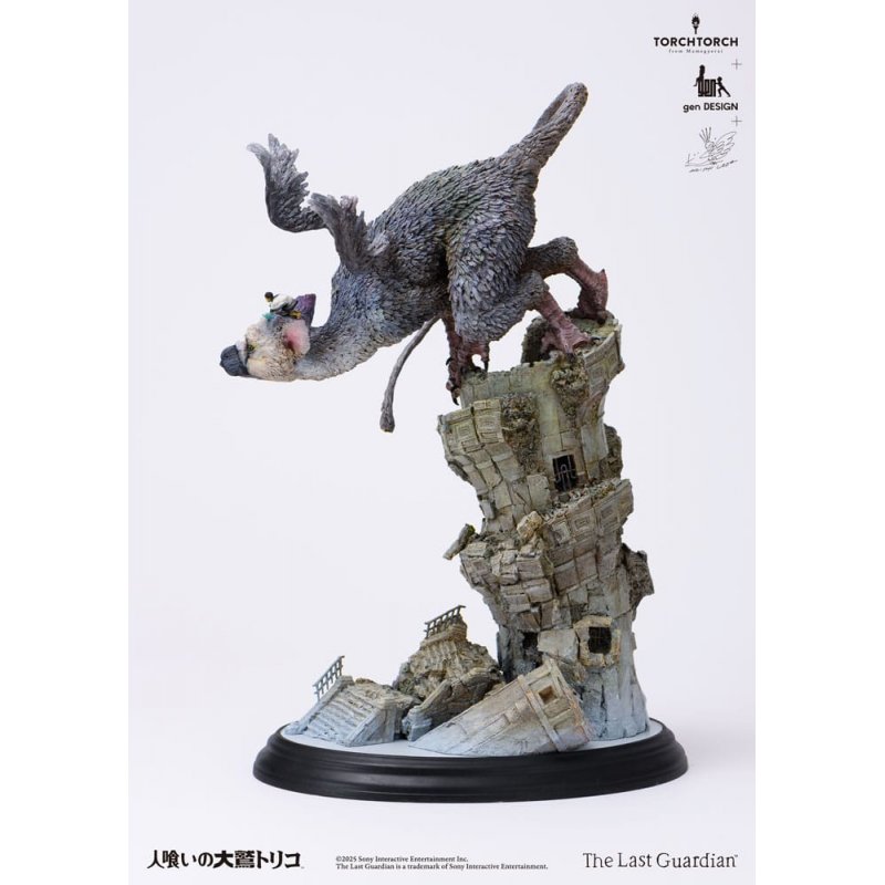"From the world of The Last Guardian comes a finely crafted statue that embodies the artistry and emotion of the game. Created under the close supervision of genDESIGN, the studio led by Fumito Ueda, this large-scale piece has been sculpted and hand-painted by acclaimed artist Akishi Ueda. Trico, carrying the boy on his back and gazing toward the next foothold, is captured in a single dynamic moment as the tower collapses around them. The piece faithfully captures Trico's complex character, combining mystique, raw power, and gentle charm. The boy's figure, clutching Trico's feathers with his clothes billowing in the air, conveys the very pressure of the wind he feels. The depiction of the tower collapsing under the impact of the landing is incredibly immersive. With clay and rubble fragments used in the modeling, you can almost hear the rumbling crash. A white gradient fading downward creates an atmospheric perspective that evokes the sense of open space beneath the base. The carefully designed color scheme, with light and shadow arranged as if the sun were overhead, showcases the signature style of Akishi Ueda. Produced by TORCH TORCH, this is the first officially licensed The Last Guardian statue worldwide. Each detail reflects our passion and commitment to quality. This is more than a character recreation. It is a commemorative art piece to be appreciated for years to come."