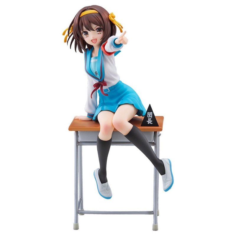 To celebrate the 20th anniversary of the TV anime series "The Melancholy of Haruhi Suzumiya," Haruhi Suzumiya has been turned into a figure clad in her iconic school uniform! She is sculpted in a dynamic pose, leaning forward as if she's about to speak, fully embodying Haruhi's energetic personality. The figure is full of intricate features such as her vibrant armband, striking composition where she sits on a desk with her arms outstretched, a skirt that has been carefully sculpted to have natural wrinkles, and even her tightly cinched waistline. Her hair flows with her movements, and her trademark ribbon further enhances the sense of dynamism. The desk also comes with a Brigade Leader Sign, a symbol of her status as the leader. This figure encapsulates the charm of the high and mighty leader of the SOS Brigade, Haruhi Suzumiya, and is sure to become a memorable addition to your collection.