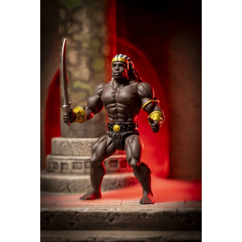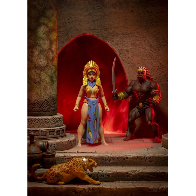 This Museum Edition figure set brings Frank Frazetta's iconic painting to life. The set includes two 5.5-inch scale figures: the Egyptian Queen with a removable skirt and scarf, and the Guard equipped with a sword. Both figures feature multiple points of articulation. Exclusive to this edition are a jaguar accessory, a staircase with column, and a cardboard backdrop, all presented in a window display box.