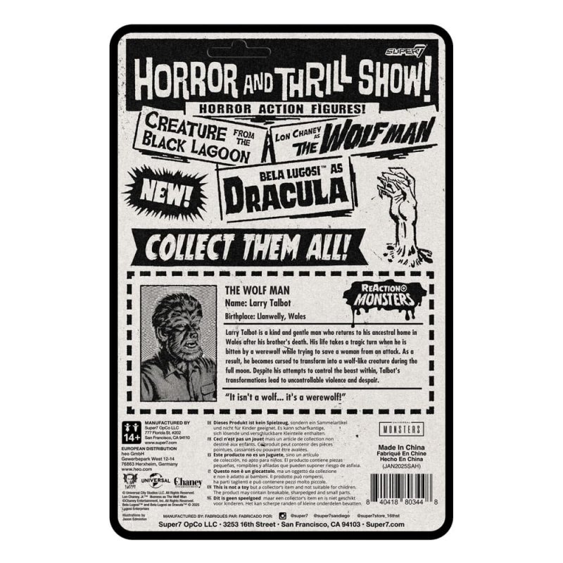 Creature feature marathon? We double (triple) dare you! Lure Super7's latest Universal Monsters ReAction+ Figures to your lair. The Creature from the Black Lagoon, the Wolf Man, and Dracula are ready to stalk your shelves as O-ring design action figures with intricate paint and sculpt details. Dracula and The Wolf Man come with an accessory specific to their character, and they're inspired by classic Universal Studios films. Blister card packaging includes original artwork influenced by movie poster designs, and each card back tells the legend or story behind the creatures who've been haunting the imaginations of horror fans since days of yore. If you lurk too long, you might miss out, so hurry to make these figures the scary best part of your collection.A moonlit walk through the woods is just not the same without the Wolf Man. Fortunately, he's here as a Super7 ReAction+ Figure. Inspired by the 1941 film, The Wolf Man, this 3.75" scale action figure is constructed based on an O-ring design. It has a swivel head and arms, elbow and knee hinges, and disk joint shoulders. He even comes with a walking cane accessory that has a handle shaped like a wolf's head! Don't wait for the next full moon to bring the Wolf Man home as a ReAction+ Figure. Keep him safe in your collection and let the rest of your Universal Monsters set show him a howling good time.Bullets:- Inspired by the Universal Studios' film, The Wolf Man (1941) - 3.75" scale with O-ring design - Blister card package with original artwork, influenced by vintage movie poster designs - Swivel head and arms, elbow and knee hinges, and disk joint shoulders - Intricate paint and sculpt details - Walking cane accessory included - The perfect gift for any Universal Monsters collector or horror fan! Collect the entire assortment of action figures, accessories, and apparel by Super7!