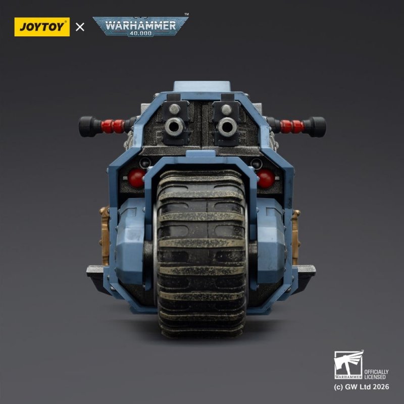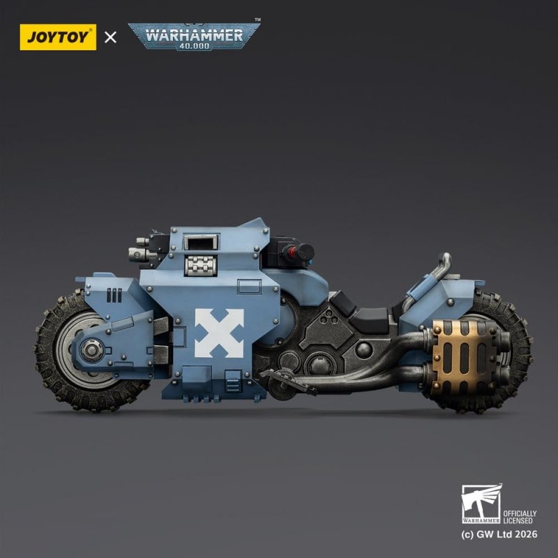 This action figure from the Warhammer 40,000 license is manufactured by Joy Toy (CN). It depicts the Raider-pattern Combat Bike Space Wolves with twin-linked bolt rifles and has a height of 22 cm.