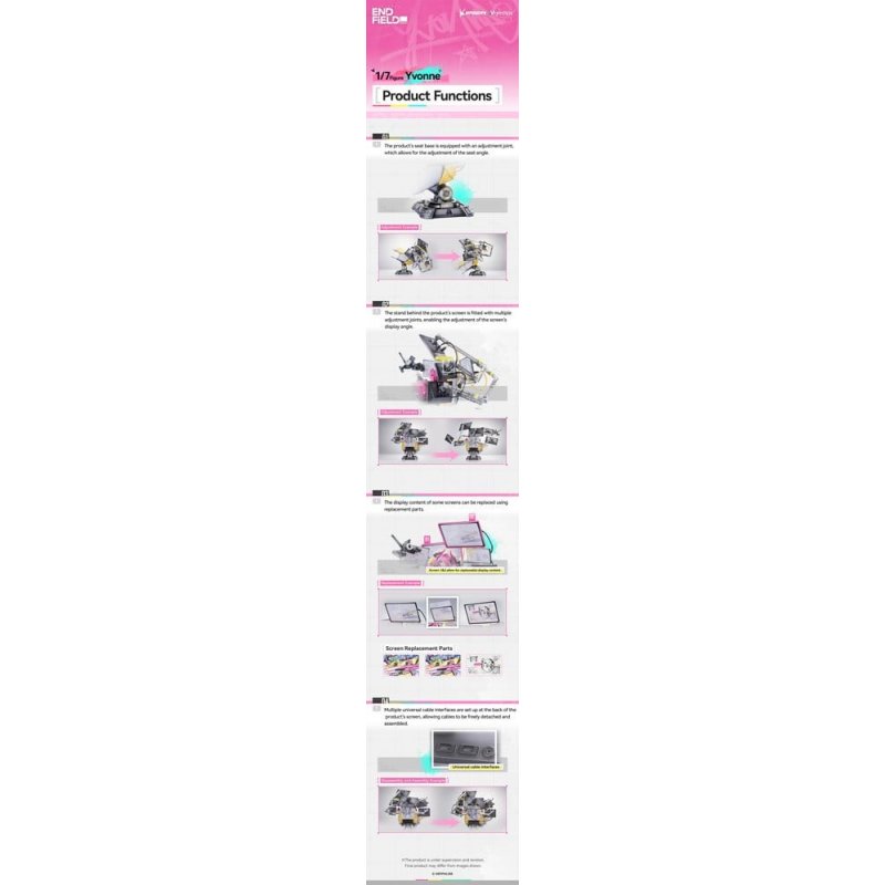 From the hit new game Arknights: Endfield, a 1/7 scale figure of Yvonne is coming soon!Yvonne reclines in her ergonomic chair, enveloped by tiers of screens. She wears a precisely tailored top paired with trousers that fade from white to pink. The sleeves of her cropped jacket replicate a combination of transparent and opaque materials, rendered with pearlized and laser-effect finishes to recreate layered textures. Her twin ponytails curl with defiant curves, while the tail coiled behind her is brushed with vibrant hues of Yvonnes' choosing, showcasing her individuality and flair. Both the base of the ergonomic chair and the monitor stands feature adjustable joints for angle customization. The product screens can be updated with interchangeable display panels, and the cables behind the monitors are detachable and reassemblable, allowing for the creation of unique scenes tailored to her preferences.Endministrators, welcome to her domain.Set Contents:- Main figure - BaseBonus:- 3 x Replaceable Display Content