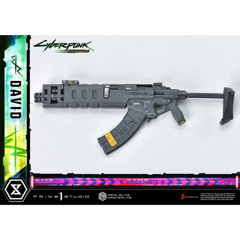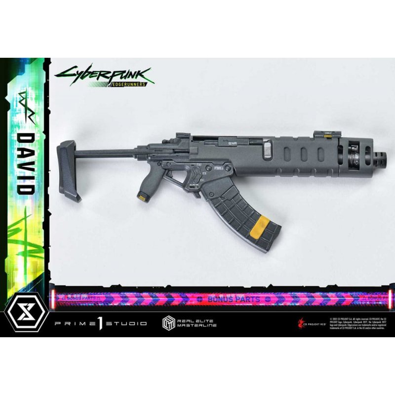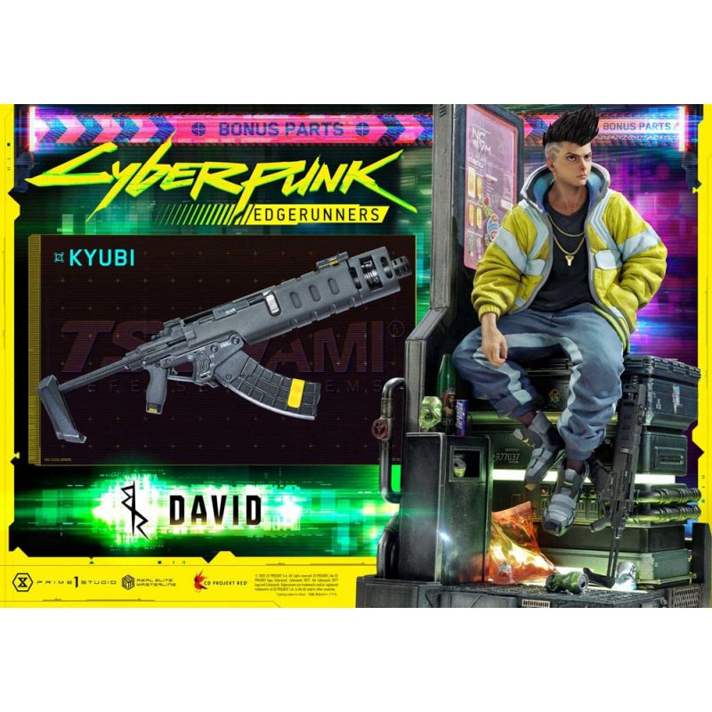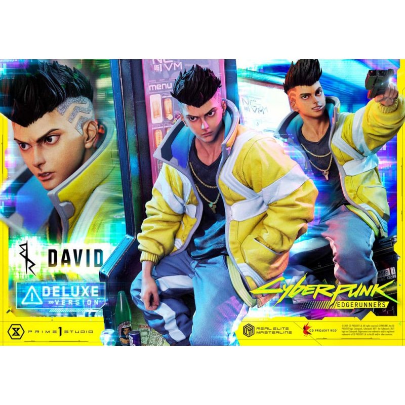"That's my dream. Honestly, nothing else ever really mattered."-David MartinezWith quiet determination that shines even in the cutthroat world of mercs and a Sandevistan that seals his fate, David from "Cyberpunk: Edgerunners" joins the Real Elite Masterline series in 1/4 scale!What if David and the rest of his crew were recreated in the CG style of "Cyberpunk 2077"? This bold concept has been brought to life as a high-precision statue. The figure captures David's defiant stance as he climbs the ranks of Night City's underworld, creating a harmonic combination of the game's realism with his original anime design.As CD PROJEKT RED Producer Saya Elder highlighted during Prime 1 Studio's Next Level Showcase XIII, the sculpt and paintwork faithfully reflect the world of "Cyberpunk: Edgerunners", down to the finest details. The clean line art of David's side-shaved hairstyle, his expression of ambition and innocence, and his mother's iconic yellow jacket all incorporate elements of the anime's design while introducing new layers of appeal.The specially crafted base is inspired by Afterlife, the legendary bar. Neon lights are rendered using LED and reflective paint, combined with weathered stickers and crushed cans to evoke the deep, moody atmosphere of Night City after dark.The Deluxe Bonus Version includes a wide range of interchangeable parts for diverse display options. Choose from subtle head tilts or a cocky grin as he draws his weapon. With the Pulsar and two head stands, you can recreate a variety of scenes to match your vision.This version also includes the Kyubi power assault rifle as an exclusive bonus, allowing you to add an explosive weapon that brings a serious edge to the fight.Add this young edgerunner to your collection! Designed in the aesthetic of "Cyberpunk 2077", David can be paired with Lucy and Rebecca to bring together the whole crew.Specifications:- Cyberpunk: Edgerunners Themed Base with LED Illumination - Limited to 500 pieces - 3 x Swappable Heads (Serious, Open Mouth, Smiling) - 3 x Swappable Left Arm & Pocket Parts (Hand in Pocket, Gun Raised, Gun Aimed Forward) - 1 x Pulsar - 2 x Head Stands - 1 x Kyubi [BONUS PART] LED Power Supply Method: TBD * Please prepare batteries, USB cables, or other necessary items depending on the final power supply method.