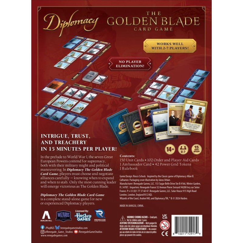 In the prelude to World War I, the seven Great European Powers contend for supremacy, both with their military might and political maneuvering. In Diplomacy: The Golden Blade Card Game, players must choose and negotiate alliances carefully-knowing when to expand and when to stab. Only the most cunning leader will emerge victorious as The Golden Blade.Diplomacy: The Golden Blade Card Game is a complete stand-alone game for new or experienced Diplomacy players.Contents- 84 Order Cards - 14 Hold/Player Aid Cards - 4 Two-Player Variant Cards - 150 Unit Cards - 21 Power Tokens - 7 Level 1 Tokens - 7 Level 2 Tokens - 7 Level 3 Tokens - 1 RulebookFeatures- Provides all the strategy, negotiation, and backstabbing from classic Diplomacy in only 15 minutes per player! - Simple turns, deep strategy. Will you strengthen your military prowess, or negotiate an alliance with your neighbor? Will you stay true to your word, or backstab your ally at an opportune moment. - No player elimination! All players participate until the end of the game. - Plays well at all player counts, from 2 to 7!