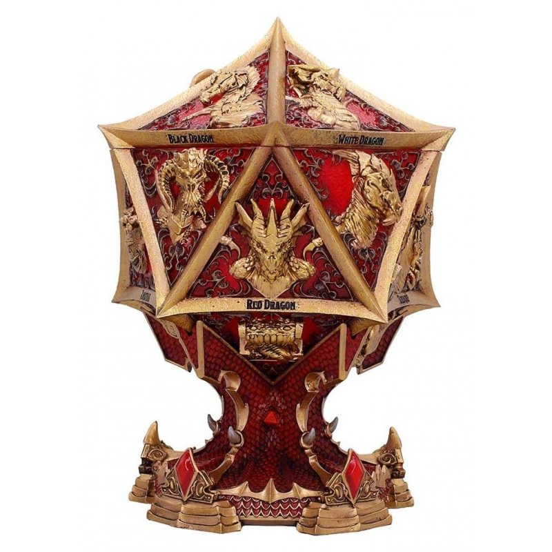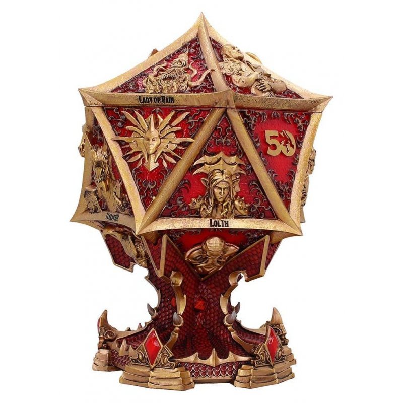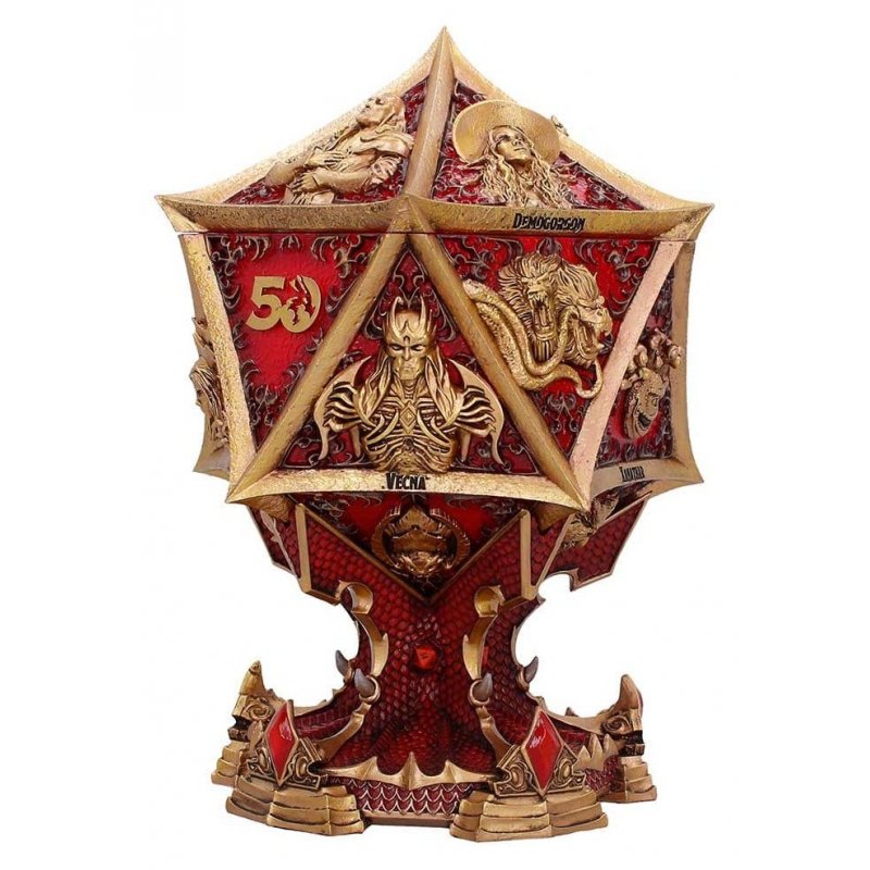 A premium collectible box crafted to celebrate the 50th anniversary of Dungeons & Dragons, in the shape of a 20-sided die.Featuring intricate 3D gold-painted artwork of the iconic D&D villains and monsters, such as Vecna, the Beholder, and many more.Along with a removable lid that reveals a red velvet interior.Packaged in an officially licensed D&D display box that ensures safe transport and enhances its collectible appeal, perfect for display in stores or gifting to fans.Ideal for long-time D&D players, collectors of fantasy memorabilia, TTRPG fans, and gift buyers looking for a standout piece to mark the franchise's milestone anniversary.Celebrate five decades of adventure with this show-stopping, hand-painted anniversary box, a must-have collectible for D&D fans and a striking centrepiece for any fantasy display.