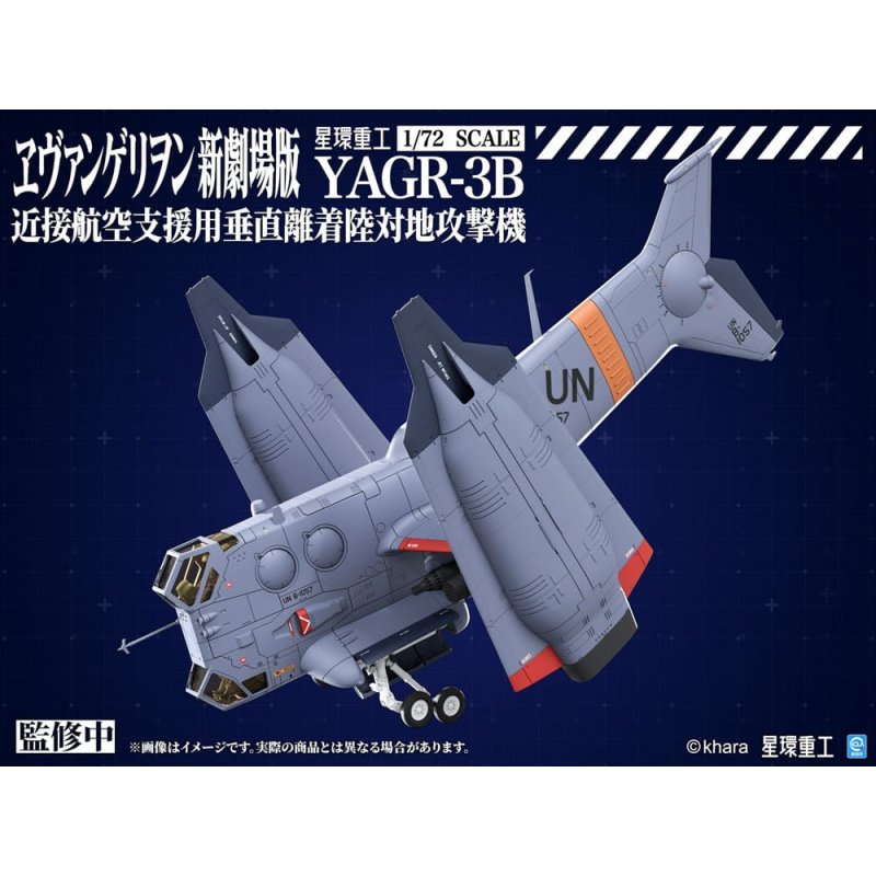 "PLANET-RING presents the YAGR-3B UNAF Close Air Support VTOL Aircraft, featured in EVANGELION:3.0+1.0 THRICE UPON A TIME, as a 1/72 scale plastic model kit.While referencing the various YAGR-3B designs that appeared throughout the film, the development team refined and expanded both its exterior and internal design to give the aircraft a more realistic look. The final model stays true to the spirit of the original design while creating a model with a sense of realism.Furthermore, both a plastic kit that requires no paint or glue, and a pre-assembled, pre-painted metal alloy version are being released simultaneously. The plastic version also includes stickers and waterslide decals, giving modelers the freedom to customize the look of the aircraft.Additionally, optional parts for advanced builders, such as metal etched fins and a high-precision UV-cured resin pilot, are included, greatly enhancing the model's level of detail."