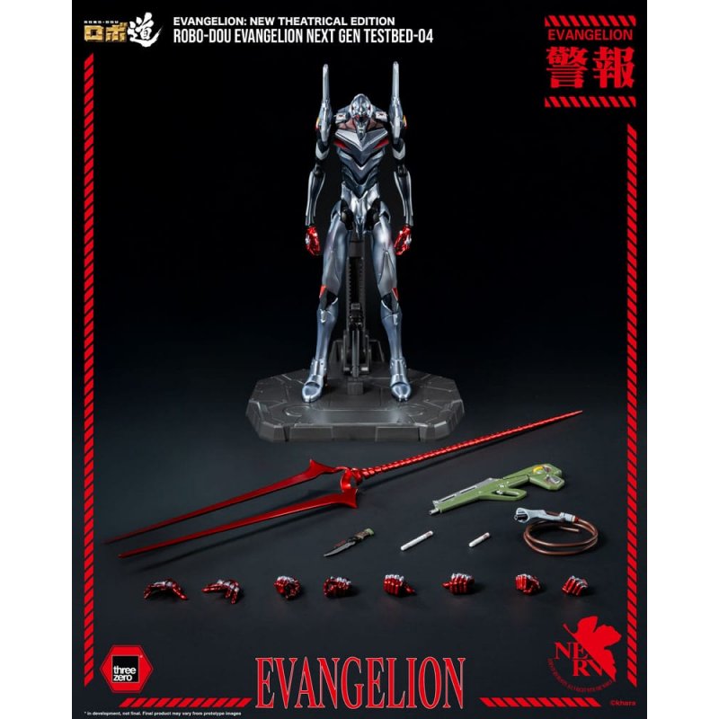 threezero is proud to present the ROBO-DOU Evangelion Next Gen Testbed-04! Previously only seen in original designs, the Evangelion Next Gen Testbed-04 is meticulously brought to life.Constructed with a die-cast zinc alloy frame and exterior, the figure stands approximately 25 cm tall and has approximately 48 points of articulation. Roughly 75% of the total build's frame and exterior components are made of die-cast zinc alloy, which significantly enhances poseability and stability and gives the model a premium metallic feel. Additionally, it features a metallic paint finish which accentuates its intricate mechanical details, with a striking contrast between icy silver and fiery red that brings the figure to life.The figure comes with a variety of accessories, including a Spear of Longinus painted in metallic red, which matches the overall color scheme. Also included are two interchangeable Entry Plugs, a Progressive Knife, a Pallet Rifle, an Umbilical Cable, multiple pairs of interchangeable hands, and a dedicated ROBO-DOU Action Stand for displaying the figure in dynamic poses.FEATURES- Approximately 25 cm (9.8") tall - Approximately 48 points of articulation, roughly 75% of the total build's frame and exterior components are made of die-cast zinc alloy - Die-cast zinc alloy frame and exteriorACCESSORIES- 1 Progressive Knife - 1 Pallet Rifle - 2 interchangeable Entry Plugs: one (1) short Entry Plug (for inserted mode), and one (1) long Entry Plug (for extracted mode) - 1 Spear of Longinus - 1 Umbilical Cable - 5 pairs of interchangeable hands: one (1) pair of relaxed hands, one (1) pair of fists, one (1) pair of opened hands, one (1) pair of hands for holding Melee Weapon, and one (1) pair of hands for holding Pallet Rifle - 1 ROBO-DOU Action StandMaterial: ABS, PVC, POM, zinc alloy