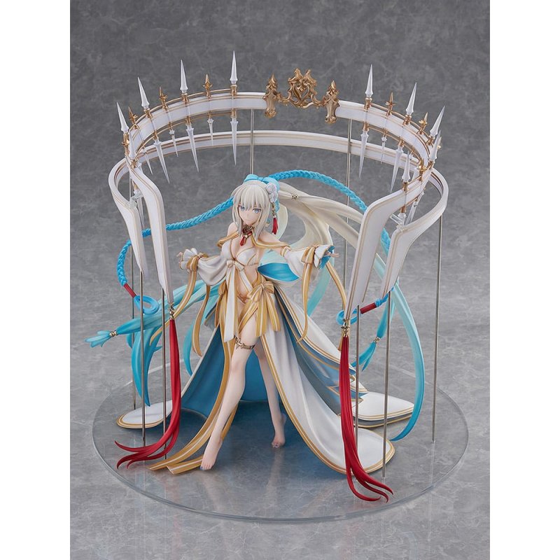 Morgan, who has gained a new Spirit Origin as a Caster, has been brought to life in her swimsuit form.Her swimsuit, designed like a dress in white and gold, conveys both the elegance of a Water Queen and the liberating atmosphere of summer.Every detail has been carefully crafted, from the circular ornament floating above her head to the flowing gradient paintwork of her hair.Enjoy this special version of Morgan, enchanted by the magic of summer, right at your fingertips.