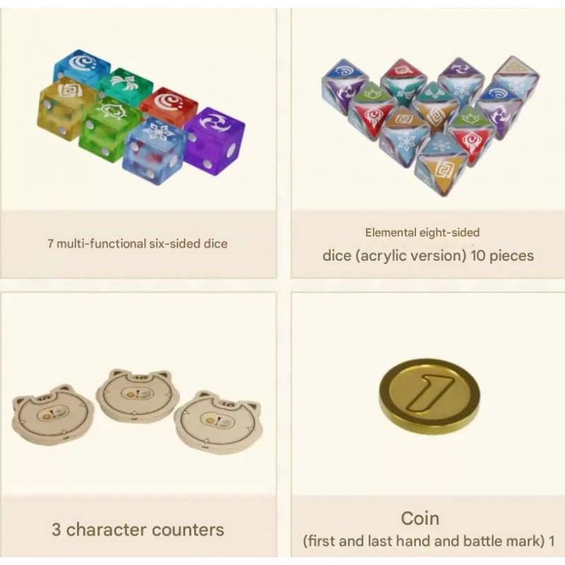 This Accessory & Dice set includes:- 7 x 6-sided Dice - 10 x Elemental Dice (8-sided) - 3 x Character Counter - 1 x CoinThis is the official chinese version with chinese texts. The Trading Card Game itself is also playable in the Genshin Impact game itself with the same rules and card abillities.