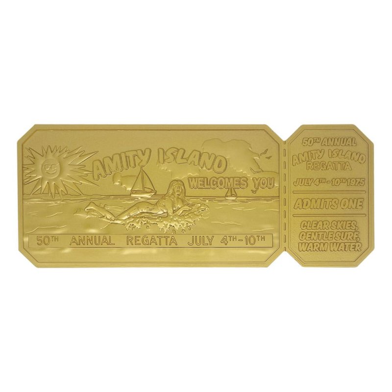 "The highlight of the summer on Amity Island, the annual regatta takes place on the July 4th weekend and sees the beaches of the island packed with tourists. Surely nothing can go wrong?Secure your place at the 50th anniversary of the regatta with this limited edition 24k gold plated ticket replica. Limited to 1,975 worldwide, each ticket measures 160 x 65mm, is individually numbered, and comes with a display stand to show it off.- Limited to 1,975 - 24k gold plated finish - Officially licensed - Individually numbered - 160 x 65mm"