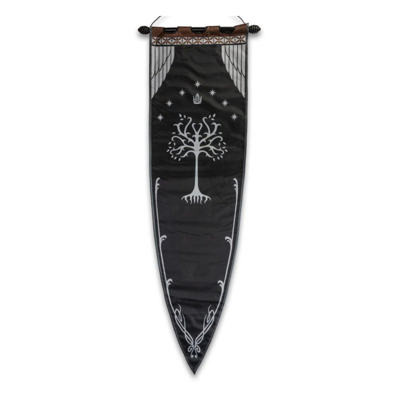Inspired by the banner carried for Aragorn in The Lord of the Rings: The Return of the King, this officially licensed Gondor War Banner is a faithful reproduction made for display. Crafted from high-quality nylon cloth, it features the iconic White Tree of Gondor, the Seven Stars symbolizing the Palantíri and ships of Elendil, and the King's Crown. Measuring 59 1/2" long by 17 1/4" wide, the banner includes a wooden hanging rod for easy wall display. Whether you're outfitting a collection room, decorating a themed event, or celebrating your love of Middle-earth, this striking piece brings the grandeur of Gondor into your space.