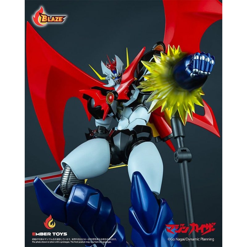 The Ember Toys diecast action figure series BLAZE is finally here! Kicking off this new series is the BLAZE Mazinkaiser (Original Edition).Features an innovative, world-first double-action functionality- Electric spinning Turbo Smasher Punch motors are built into both forearms! The Kaiser Pilder (with magnets) can be moved close to activate the switch, allowing the forearms to rotate at high speed. The built-in battery allows the figure to be displayed wirelessly with effect parts, even when separated. (Requires LR41 batteries x6, sold separately) - Light-emitting Fire Blaster LED screen on the chest displays "Z," "Demon," and "God" sequentially Realistically recreates the charging and firing of photon energy with a blinking light effect. *Kaiser Pilder with built-in magnets can be moved close to activate the magnetic switch. (Requires LR44 batteries x3, sold separately)Superior Sculpting Quality- Rebuilt with a modern, streamlined design based on the powerful look of the game version. - The seamless Kaiser Scrander and sleek head design project a truly unique presence.Impressive specs and range of motion. Massive size.- Head height: approx. 26cm (approx. 39cm total height with Kaiser Scrander attached). - 65 points of articulation across the body, with a unique construction that allows for dynamic posing. - Durable design: The thighs and shins of the figure are made with diecast parts. The internal frame also uses die-cast and POM material to maximize stability.Plenty of accessories- Armaments: Shoulder slicer (can be unsheathed), Giganto Missile - Display: Parts for recreating the Jet Boomerang and a dedicated stand with rotating turntable included.