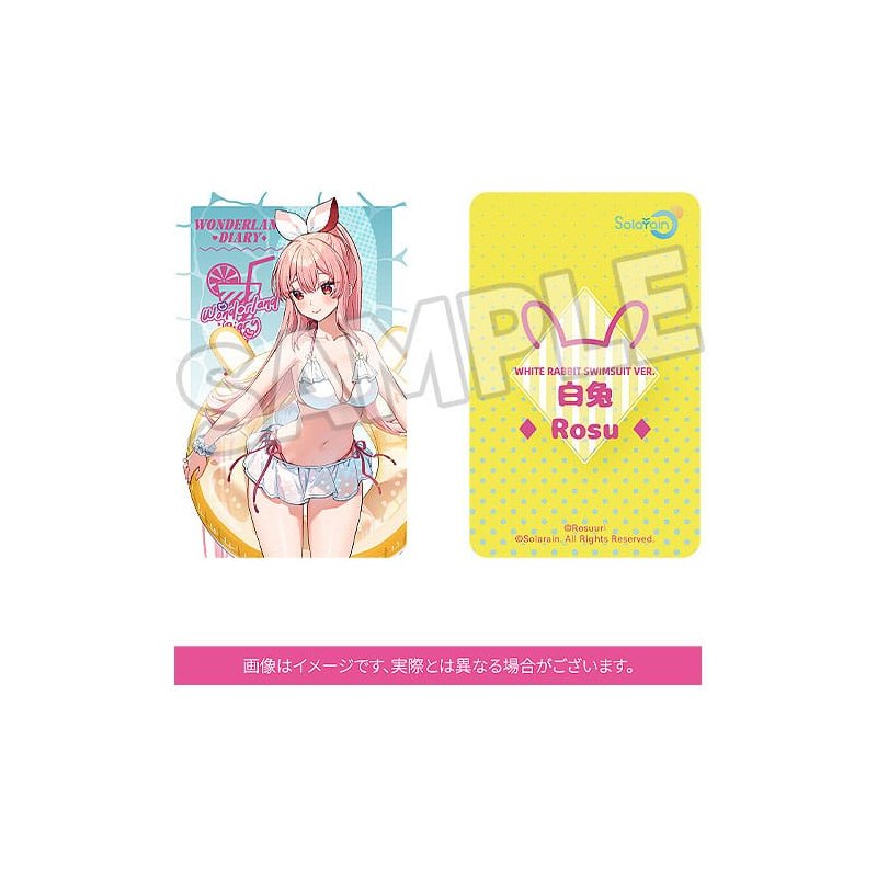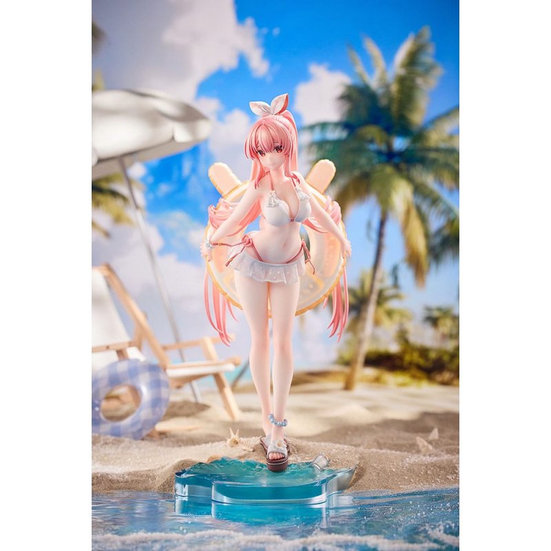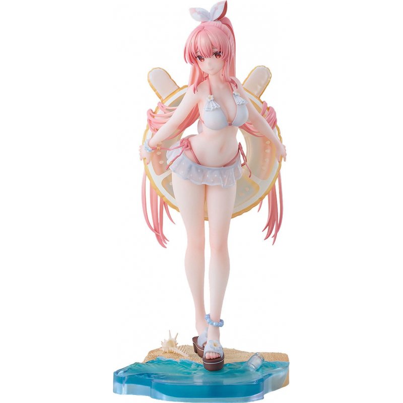 Popular illustrator Rosuuri's original character White Rabbit Rosu is now a scale figure in her summery swimsuit! Rosu wears a bashful smile that is sure to steal your heart. Her translucent skin, fluttering pink hair and rabbit ear ribbon accessory all work hand in hand to bring out her adorable charm. Her frilly white bikini and translucent rabbit-shaped swim ring give the figure a refreshing beach-like feel just like the atmosphere of the original illustration. Other details such as the seashells and beach bottles have been carefully sculpted and added to the base, which can be connected to the base that comes with Cheshire Cat Mika: Swimsuit Ver. Be sure to add Rosu and Mika to your collection! White Rabbite Rosu: Swimsuit Ver. Collector's Card