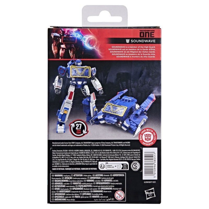 Experience the epic action of Transformers ONE with the Transformers Studio Series Soundwave action figure. The 5.25-inch (13 cm) figure converts from robot to hovercraft mode in 27 steps. With movie-inspired details, intricate poseability, and attachable shoulder rocket launcher accessories, this Soundwave figure makes an awesome addition to any collection. Look for more Transformers collectible toys (sold separately, subject to availability) featuring favorite characters like Optimus Prime, Bumblebee, Megatron, and more to create a lineup that is - More Than Meets the Eye.