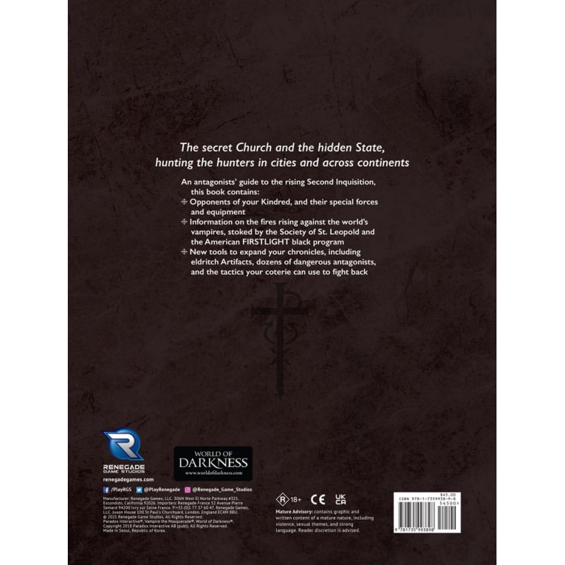 The secret Church and the hidden State, hunting the hunters in cities and across continents.An antagonists' guide to the rising Second Inquisition, this book contains:Opponents of your Kindred, and their special forces and equipment Information on the fires rising against the world's vampires, stoked by the Society of St. Leopold and the American FIRSTLIGHT black program New tools to expand your chronicles, including eldritch Artifacts, dozens of dangerous antagonists, and the tactics your coterie can use to fight back At a Glance- 140 page hardcover full color book - Includes a blood red satin bookmark ribbon - This is a supplement for Vampire: The Masquerade 5th Edition Roleplaying Game Core RulebookMature Content Warning: Contains graphic and written content of a mature nature, including violence, sexual themes, and strong language. Reader discretion is advised.