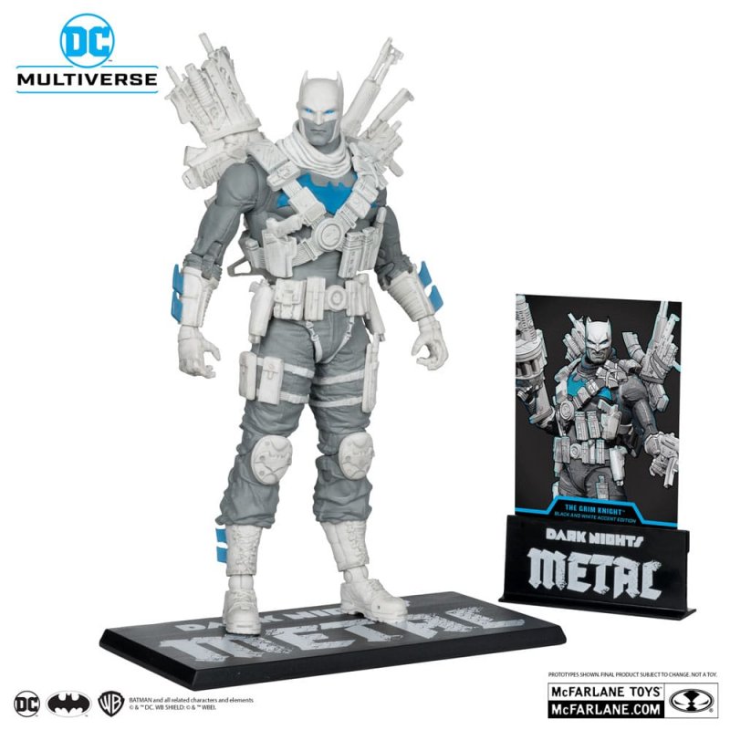 Ripped from Batman™'s greatest nightmares, The Grim Knight™ is his world's most dangerous vigilante, unafraid to use any weapon and go to any lengths to stop those he deems worthy of death. Armed with the finest arsenal Wayne money can buy, he is now one of the deadliest Dark Knights™ in existence, second only to The Batman Who Laughs™.Product Features:- The Grim Knight™ is featured in a black and white suit with pops of blue accents - Based on the comic book story arc Dark Nights Metal™ - Incredibly detailed 7" scale figure comes in limited edition slip cover packaging - Accessories include 2 weapons and back weapon attachment plus a deluxe figure base - Included collectible art card with card stand - Collect all McFarlane Toys DC Multiverse Figures