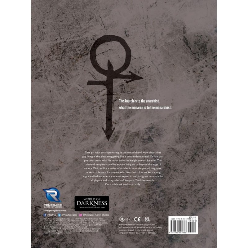 Welcome to a blood thriller on the streets of the modern nights.For centuries, the Anarch Movement enjoyed an uneasy truce with the Camarilla, but no longer. Now, the Unbound refuse to bow to the sickening hypocrisy and tyranny of their former allies.Claiming the nighttime streets as their own, the Anarchs seek independence from the despotic Elders, by any means necessary. Only the toughest and smartest of self-made vampires will survive.This sourcebook contains stories and metaplot of the Anarch Movement in modern times, as well as ruleset and lore for clan Ministry (formerly known as Followers of Set).Features:A look into the Anarch Sect with vignettes on vampires within the Anarch Movement Adds new rules to Vampire the Masquerade, including rules for the Ministry A deeper look into Anarch Clans, with lore sheets and histories to add to your gameplay experience All-new essays on nocturnal survival and politics from Juhana PetterssonMature Content Warning: Contains graphic and written content of a mature nature, including violence, sexual themes, and strong language. Reader discretion is advised.
