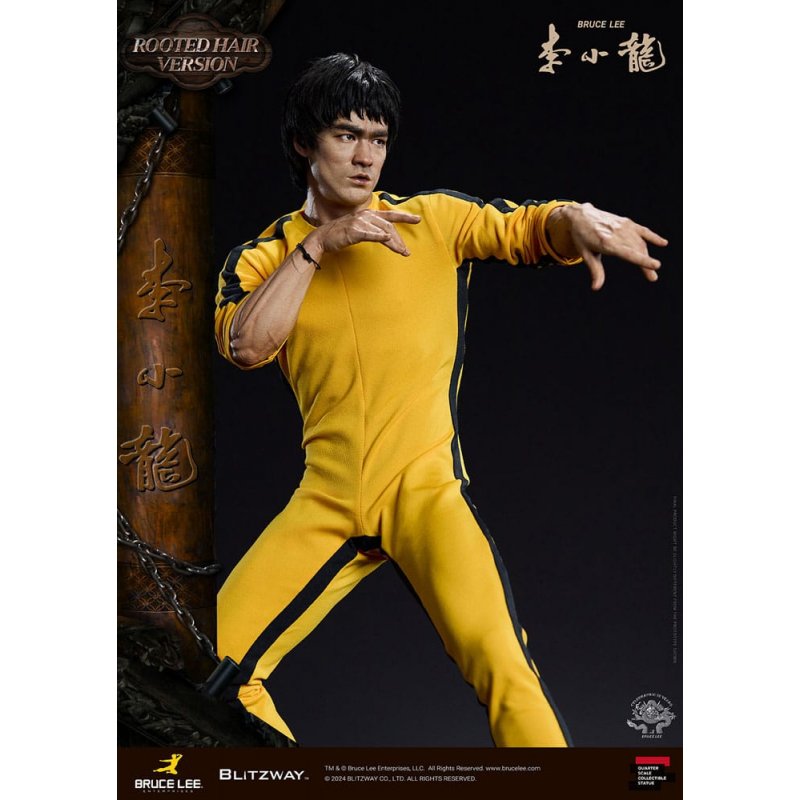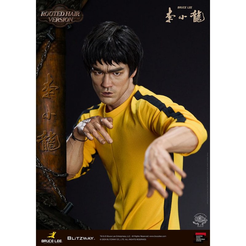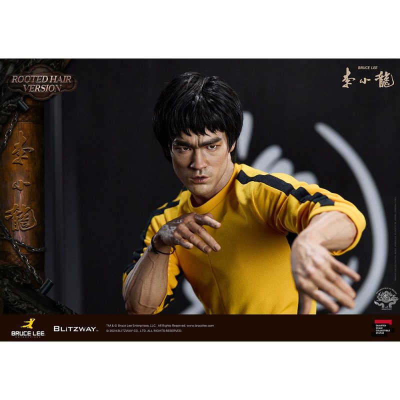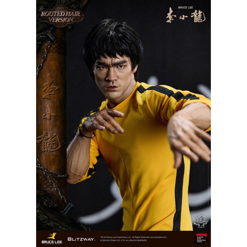 After the release of the standard version last season, we're excited to introduce the Bruce Lee 50th Anniversary Special Statue in the rooted hair version.Crafted to mark the 50th anniversary of his passing, this "Bruce Lee 50th Anniversary Special Statue" is inspired by iconic martial arts scenes from his films.With dynamic poses reflecting Bruce Lee's distinctive martial arts prowess, intricately sculpted facial expressions, and his iconic yellow jumpsuit, paired with authentic nunchaku accessories, Blitzway has faithfully captured his essence in this special statue.Both the standard and rooted-hair versions possess their own unique allure, so be sure to explore their individual charms in detail through the official photos. Moreover, both versions feature resin heads for enhanced realism and intricate detail. Blitzway has also introduced a new eye insertion method for more lifelike eye expression upgrades starting from these two products.In honor of Bruce Lee's 50th anniversary, we extend our tribute to all collectors who continue to celebrate his enduring legacy. Experience the unparalleled attention to detail firsthand!Product Specifications:- Statue Size approximately 21.4 inches tall [W 360 mm x D 320 mm x H 545 mm (Including Base)] - Highly detailed likeness sculpture of Bruce Lee - Sophisticatedly tailored and designed outfits - Oriental wooden architecture themed base - 1 x Nunchucks - 1 x Rod - 2 x Diorama Flags - 1 x Bracelet