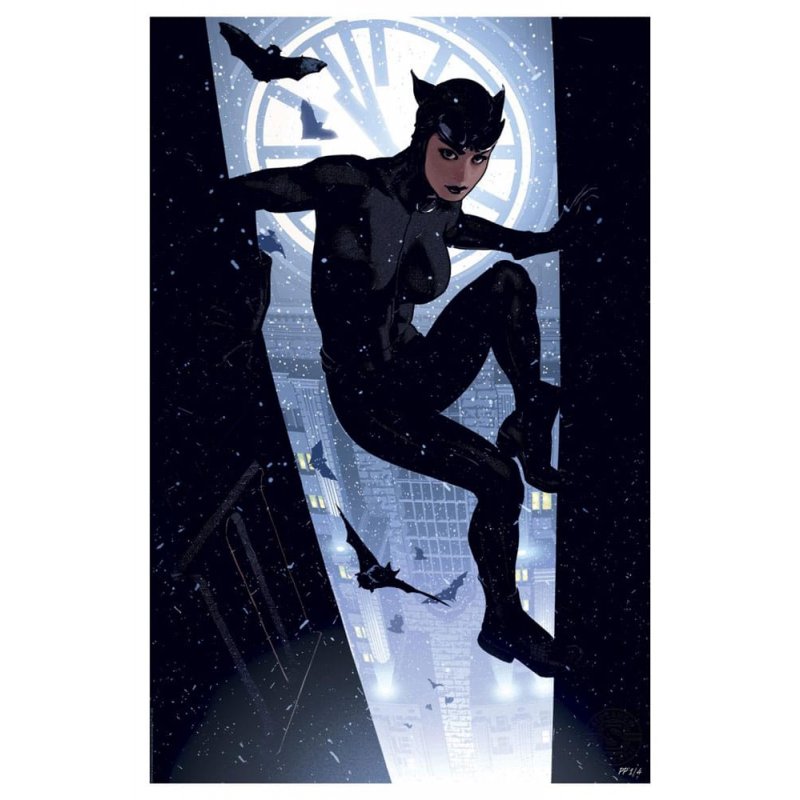 Sideshow presents the Catwoman™ Fine Art Print, a glamorous DC art print by artist Adam Hughes.Far above the Gotham City streets, a master cat burglar bides her time before a heist. Balanced expertly between two buildings, and silent as the falling snow, Selina Kyle waits for the perfect moment to strike. She has nine lives worth of patience ... and practice.Originally created as the cover for Catwoman no.64 (2007), written by Will Pfeifer for DC, this Catwoman art is now available to fans as an unframed giclée print or in a custom framed presentation. Each Catwoman Fine Art Print features an embossed Sideshow Seal of Authenticity as part of the limited edition of 200 pieces.Raise your collection to new heights with the Catwoman™ Fine Art Print by Adam Hughes! Get your pretty little paws on the Catwoman: Girl's Best Friend Fine Art Print by Ian MacDonald today!Print details: - Officially licensed by DC Comics - Limited edition of 200 - 41 x 61 cm fine art giclée print - Heavyweight 100% cotton, acid-free, certified archival Fine Art Paper - Epson archival inks - Embossed seal of authenticity