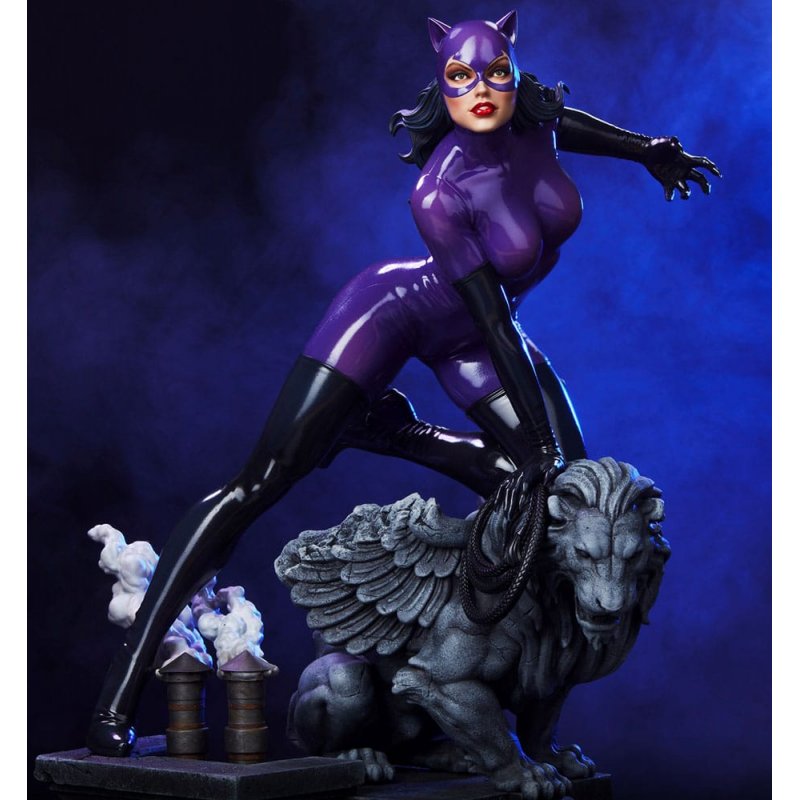 Sideshow and Tweeterhead present our newest Catwoman Quarter Scale Maquette! Gotham's most notorious thief turned ally is ready to steal your heart, and wallet! This new Catwoman (Purple Edition) Maquette measures roughly 13.875" tall, 11" wide and 8" deep in 1:6 scale, and roughly 18.375" tall, 14.65" wide and 10.6" deep in 1:4 scale, when fully assembled - from the bottom of the base, to the top of Catwoman's ears, to the furthest out points on the base, Catwoman's face and her outstretched claws. This fully sculpted polyresin statue comes with Catwoman in her throwback purple colorway, atop a lion-style rooftop ready to pounce! Dynamically posed with claws out and whip in hand, this Catwoman is ready to slink her way into your collection! Collect with Passion, Collect with Tweeterhead! Size: 47 x 37 x 27 cm